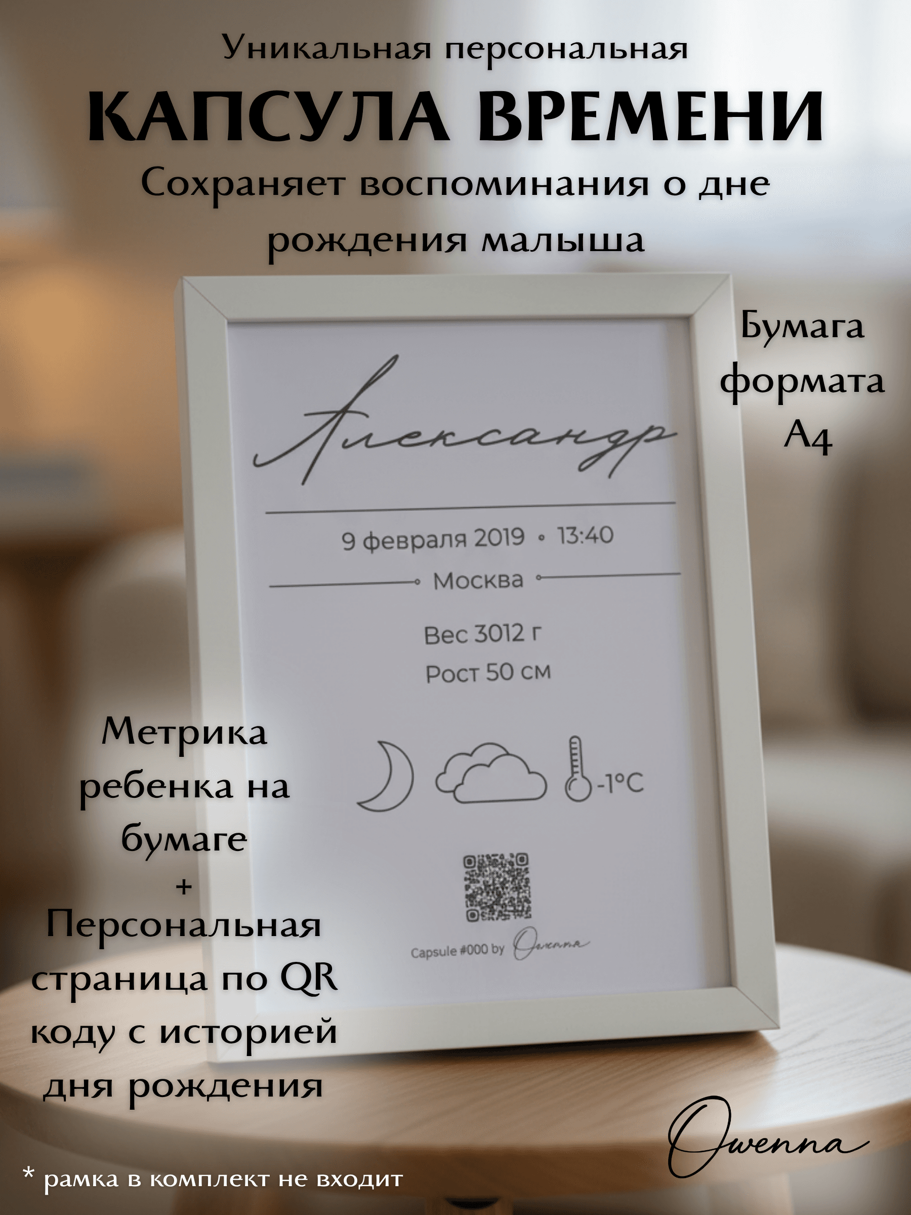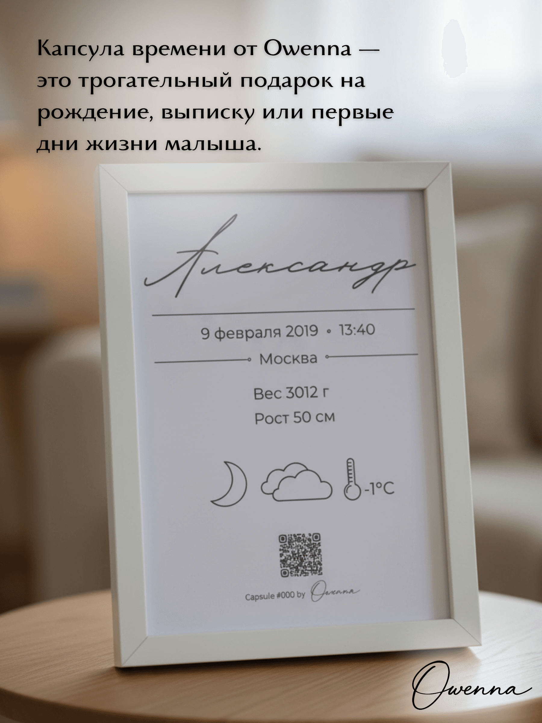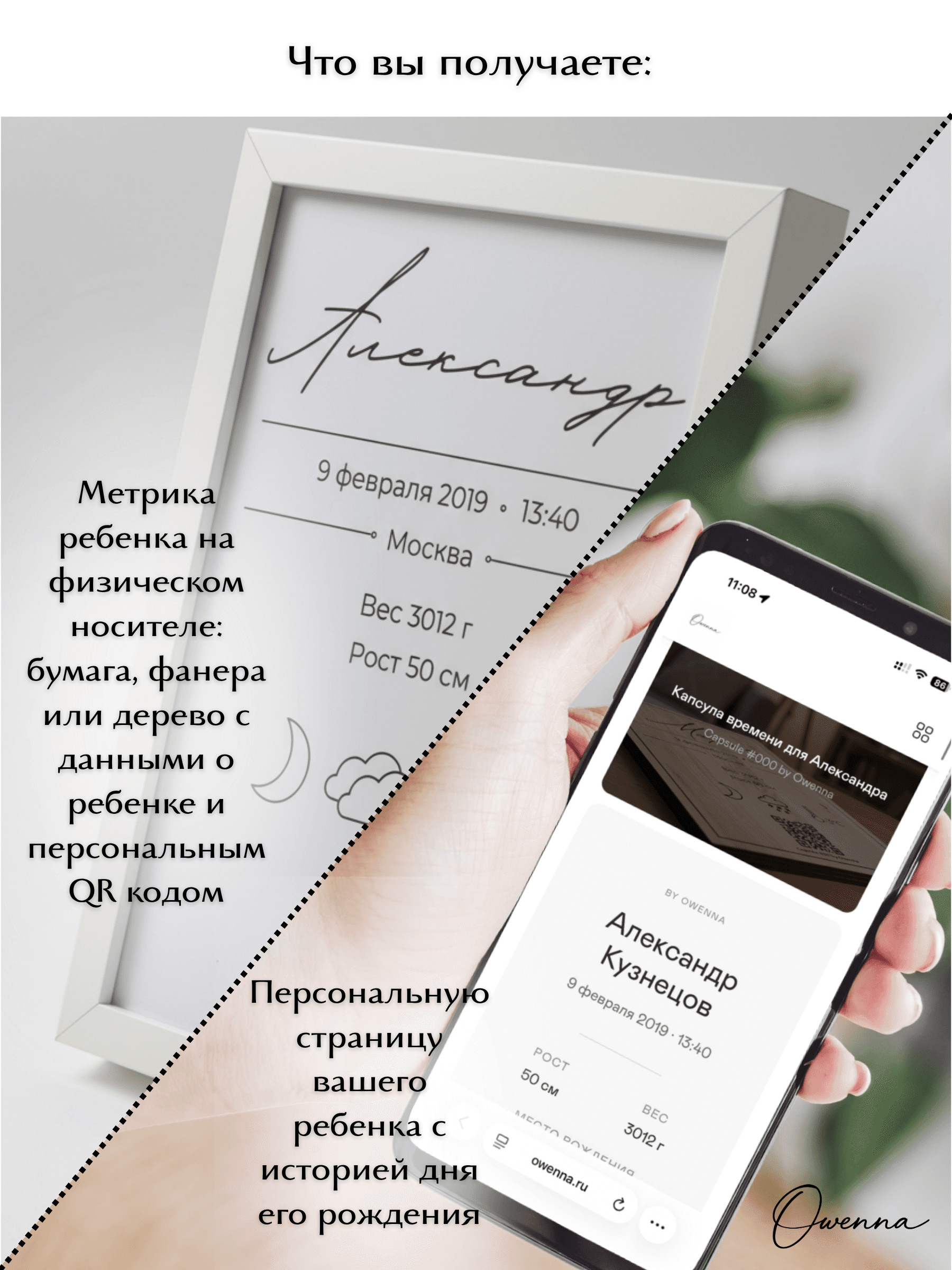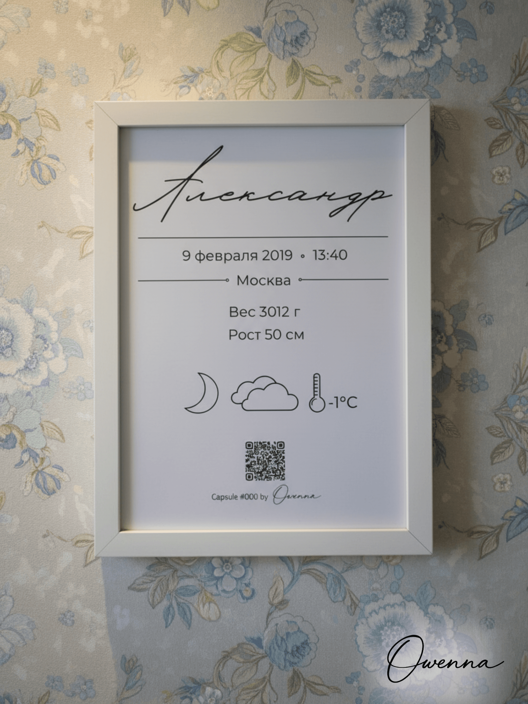 Owenna — это капсула времени о рождении вашего малыша. Персонализированное изделие, метрика с QR-кодом, ведущим на цифровую страницу с историей первых мгновений жизни: датой рождения, местом, фотографиями, погодой, тёплым семейным посланием и многим другим В комплекте — архивная PDF-копия и 2 года хранения цифровой капсулы. Что входит: • изделие с индивидуальной метрикой • QR-код на цифровую капсулу • персональная онлайн-страница малыша • PDF-архив капсулы для личного хранения • 2 года хранения цифровой версии Капсула Owenna — это трогательный подарок на рождение, выписку или первые дни жизни малыша. Выберите подходящий материал изготовления капсулы: бумага, фанера, дерево.