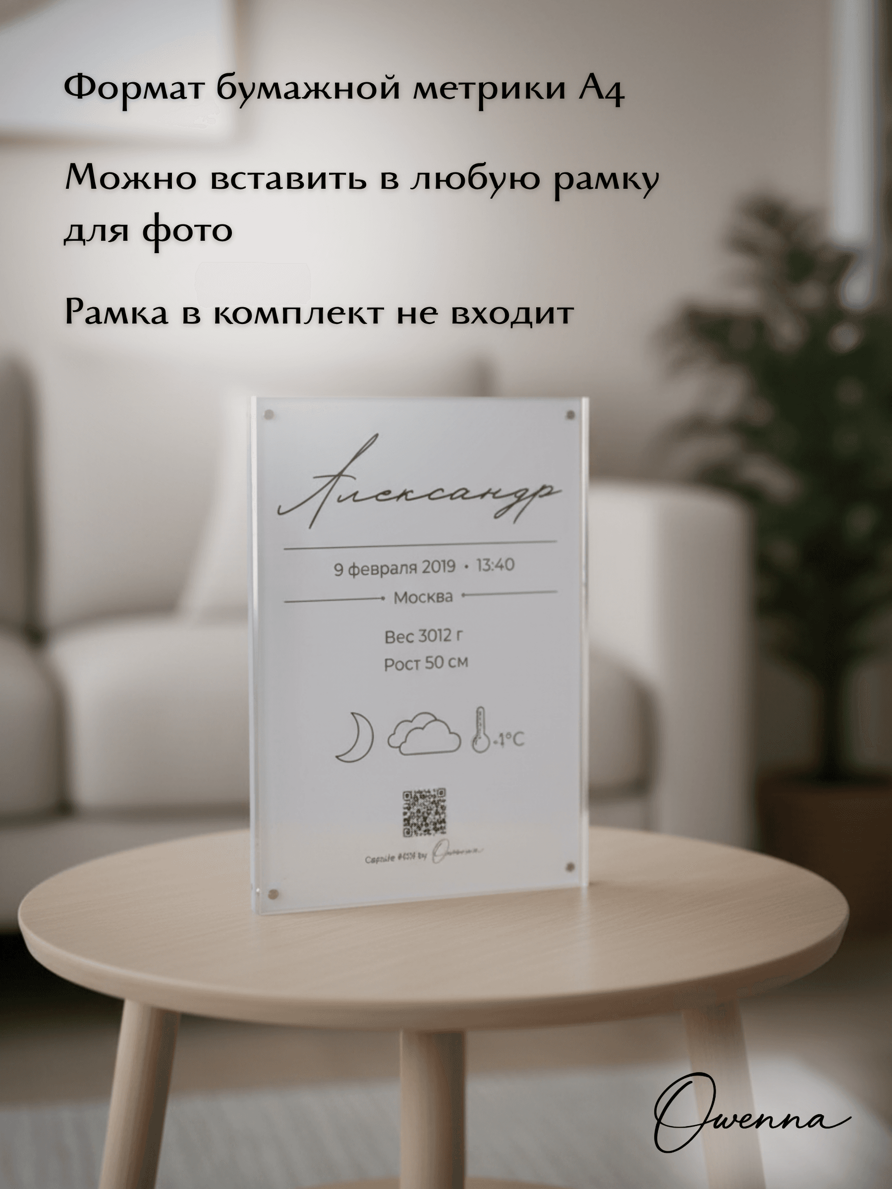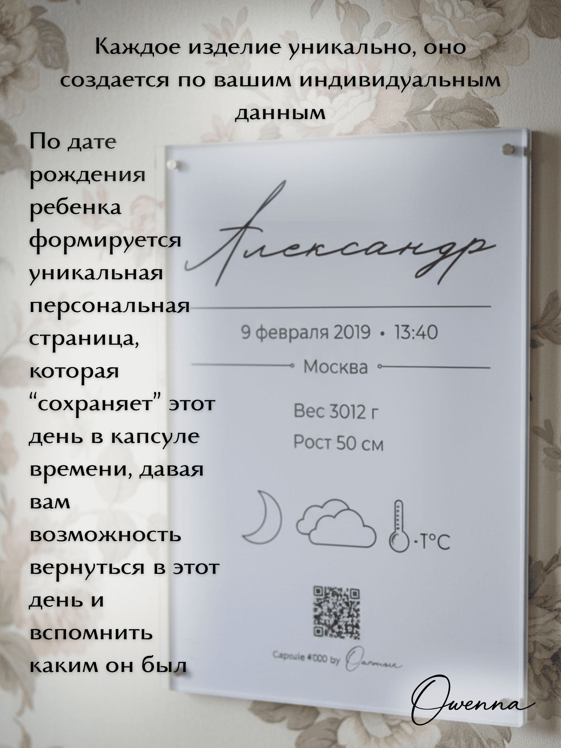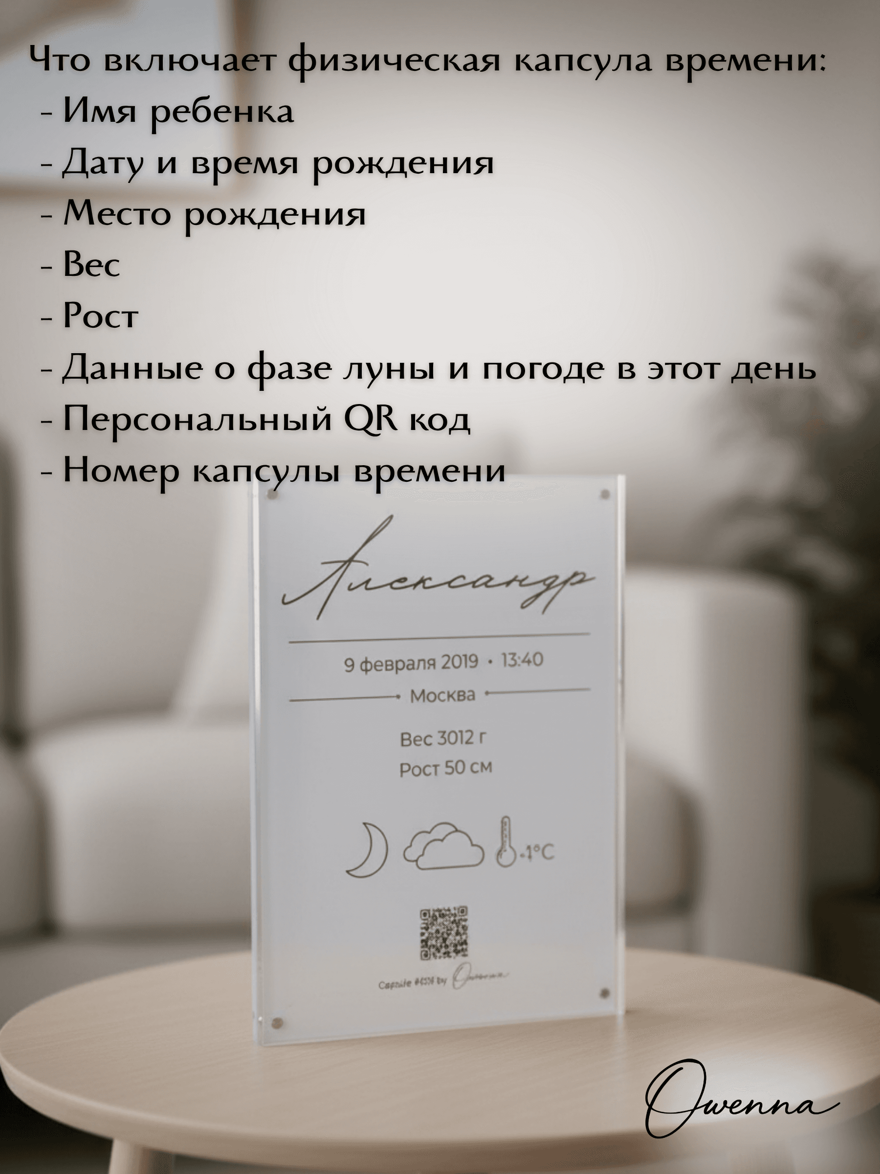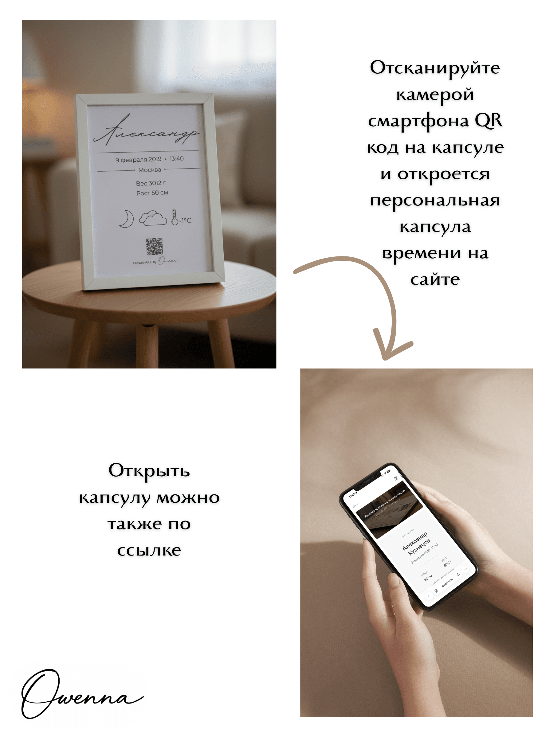 Owenna — это капсула времени о рождении вашего малыша. Персонализированное изделие, метрика с QR-кодом, ведущим на цифровую страницу с историей первых мгновений жизни: датой рождения, местом, фотографиями, погодой, тёплым семейным посланием и многим другим В комплекте — архивная PDF-копия и 2 года хранения цифровой капсулы. Что входит: • изделие с индивидуальной метрикой • QR-код на цифровую капсулу • персональная онлайн-страница малыша • PDF-архив капсулы для личного хранения • 2 года хранения цифровой версии Капсула Owenna — это трогательный подарок на рождение, выписку или первые дни жизни малыша. Выберите подходящий материал изготовления капсулы: бумага, фанера, дерево.