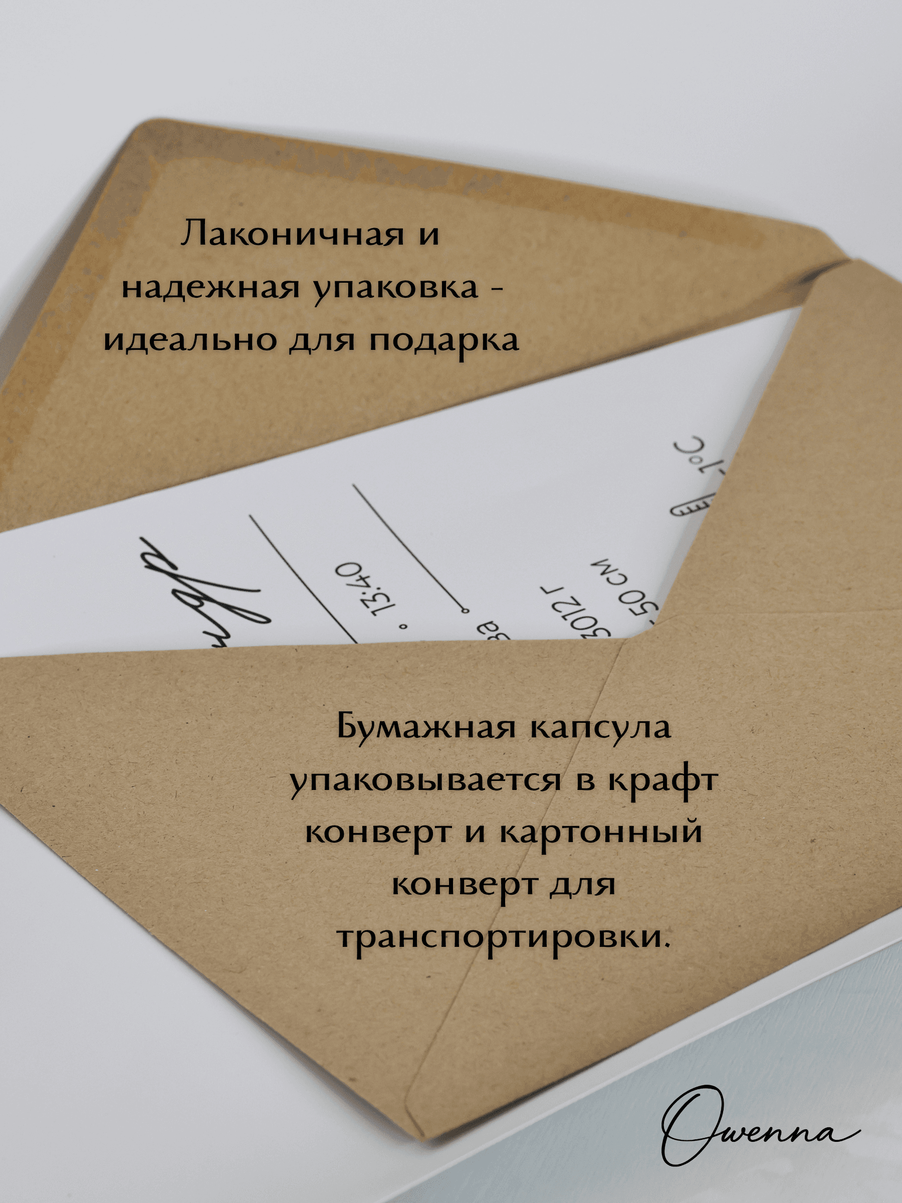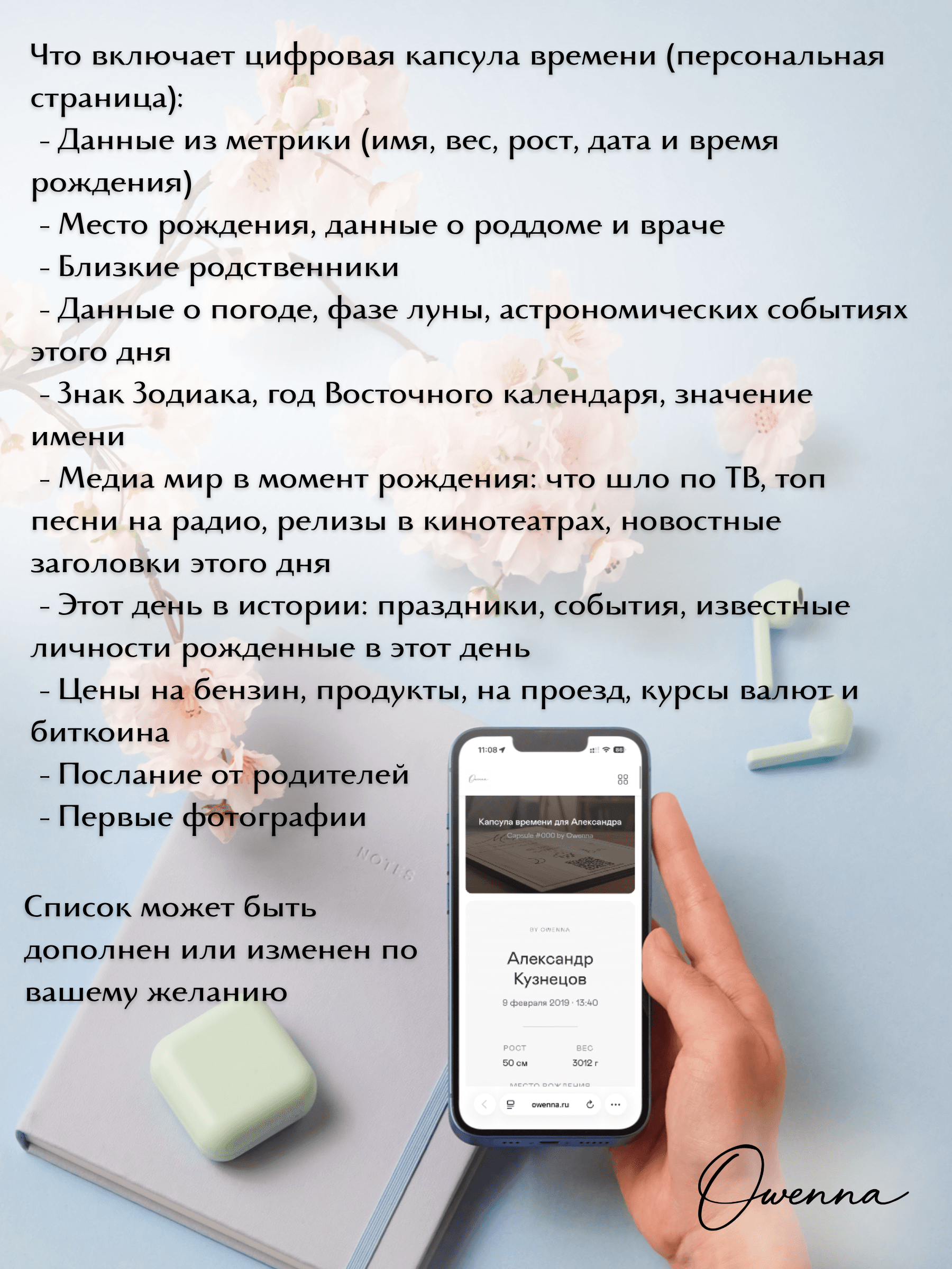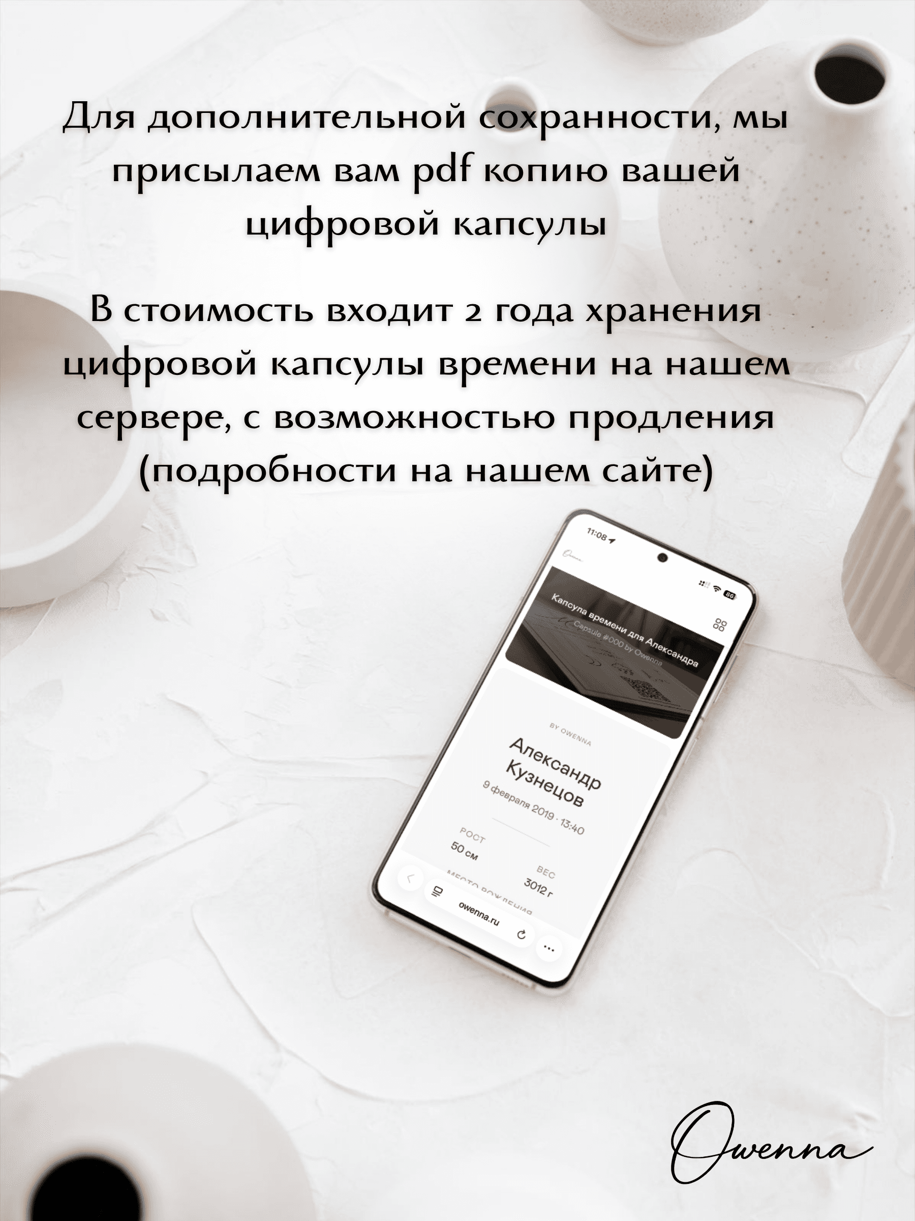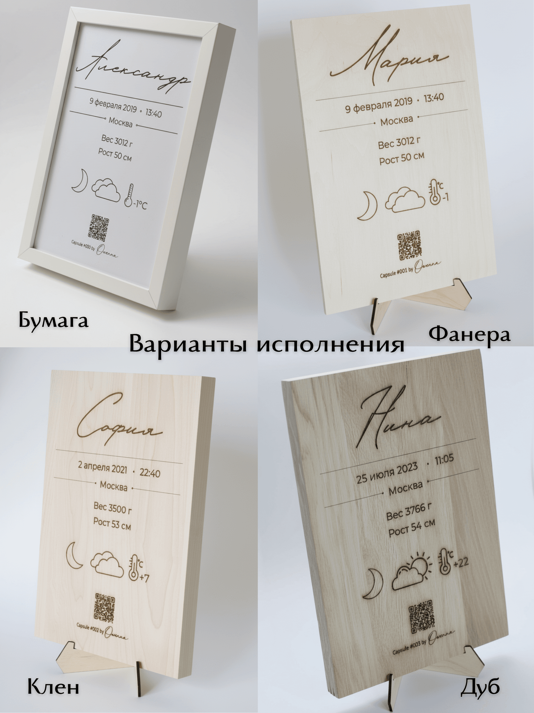 Owenna — это капсула времени о рождении вашего малыша. Персонализированное изделие, метрика с QR-кодом, ведущим на цифровую страницу с историей первых мгновений жизни: датой рождения, местом, фотографиями, погодой, тёплым семейным посланием и многим другим В комплекте — архивная PDF-копия и 2 года хранения цифровой капсулы. Что входит: • изделие с индивидуальной метрикой • QR-код на цифровую капсулу • персональная онлайн-страница малыша • PDF-архив капсулы для личного хранения • 2 года хранения цифровой версии Капсула Owenna — это трогательный подарок на рождение, выписку или первые дни жизни малыша. Выберите подходящий материал изготовления капсулы: бумага, фанера, дерево.