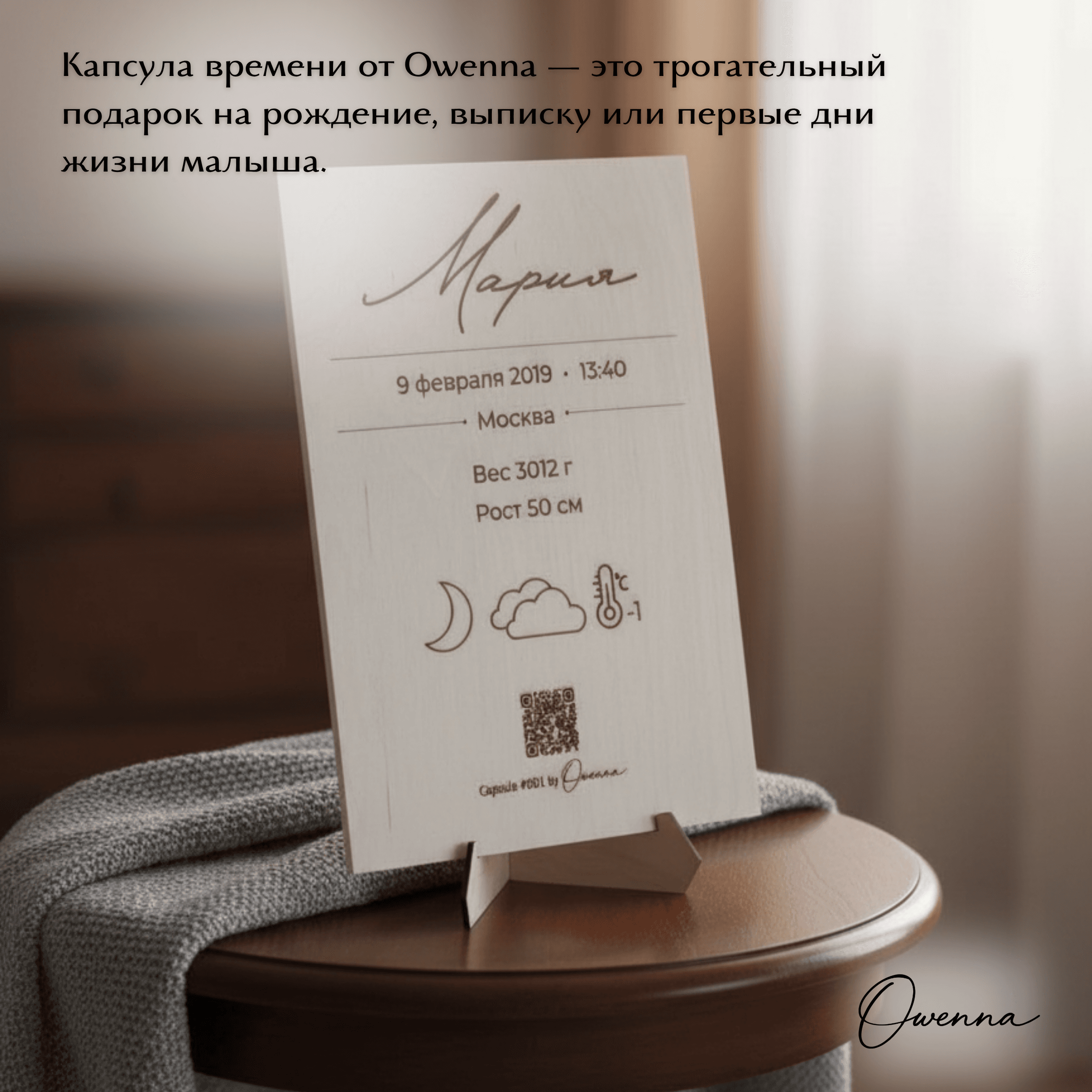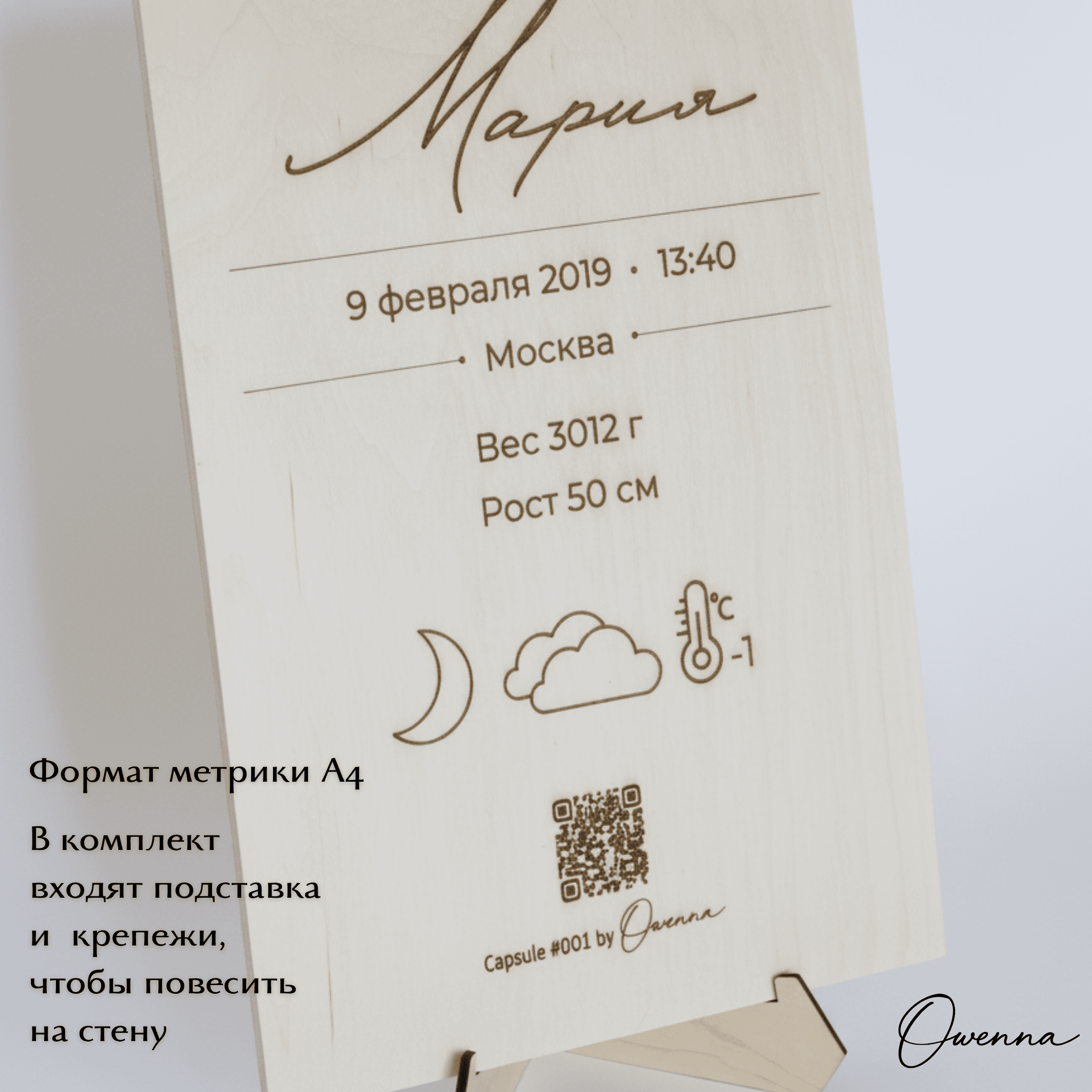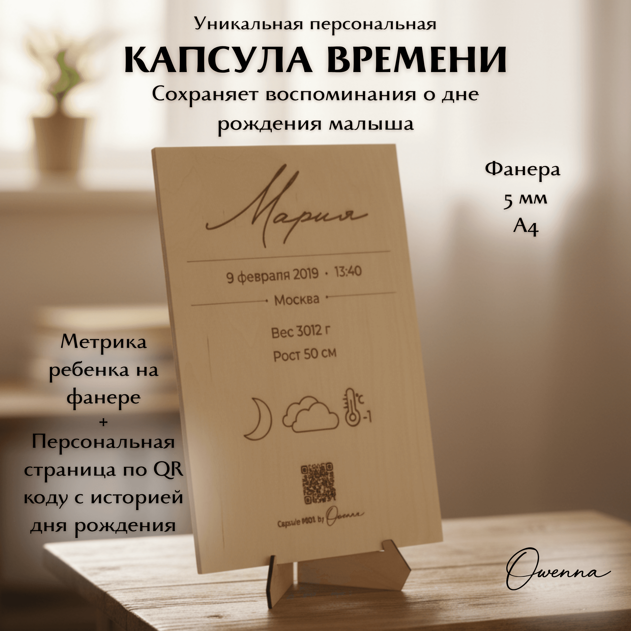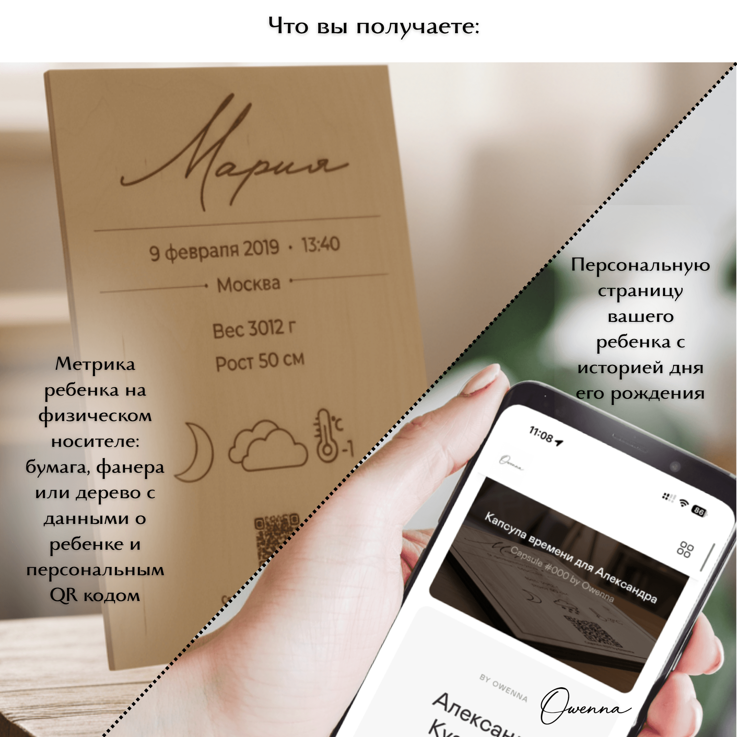 Owenna — это капсула времени о рождении вашего малыша. Персонализированное изделие, метрика с QR-кодом, ведущим на цифровую страницу с историей первых мгновений жизни: датой рождения, местом, фотографиями, погодой, тёплым семейным посланием и многим другим В комплекте — архивная PDF-копия и 2 года хранения цифровой капсулы. Что входит: • изделие с индивидуальной лазерной гравировкой метрики • QR-код на цифровую капсулу • персональная онлайн-страница малыша • PDF-архив капсулы для личного хранения • 2 года хранения цифровой версии Если вам нужно сделать несколько копий метрики на фанере, сообщите нам об этом при заказе. Стоимость копии метрики на фанере 450 руб. Капсула Owenna — это трогательный подарок на рождение, выписку или первые дни жизни малыша. Выберите подходящий материал изготовления капсулы: бумага, фанера, дерево.