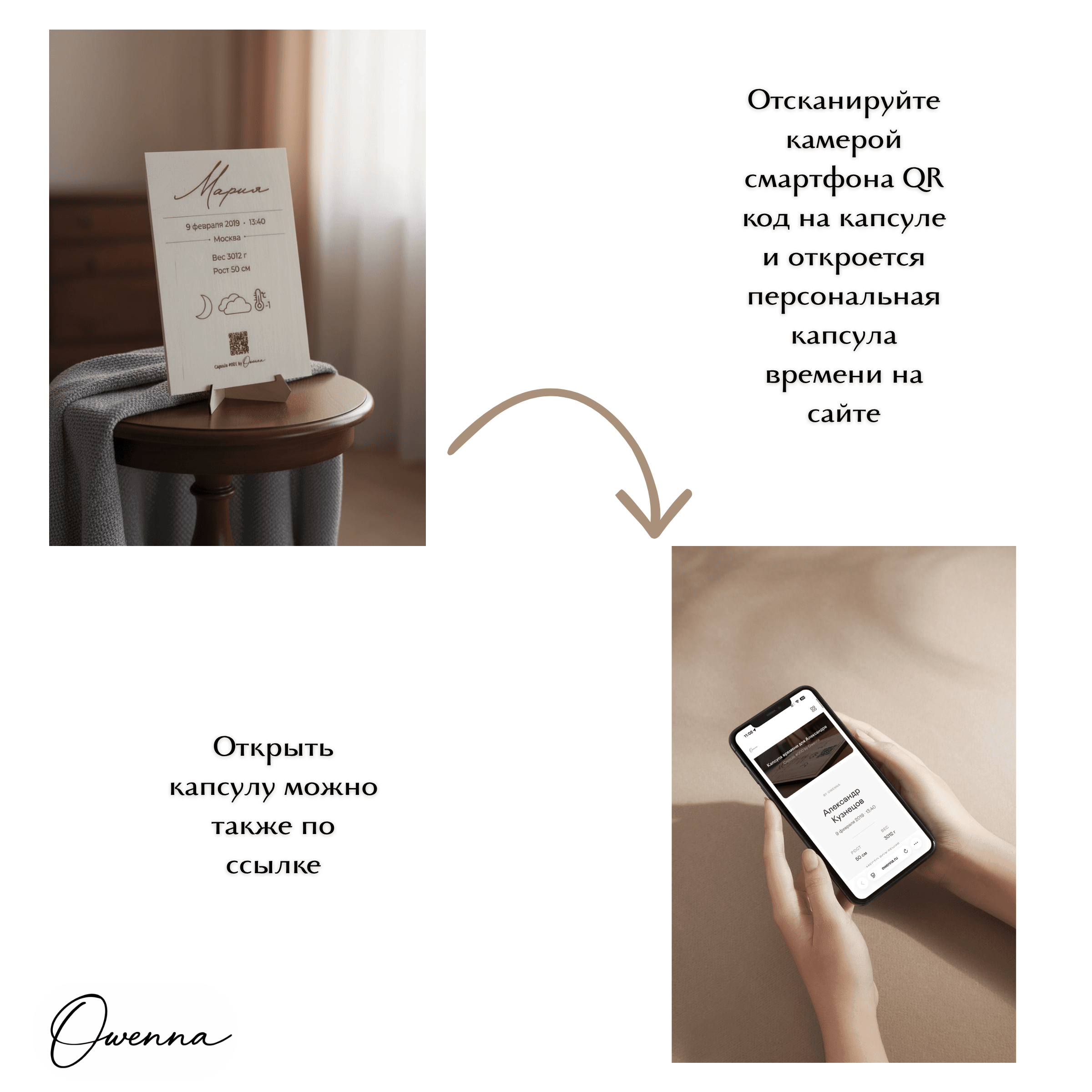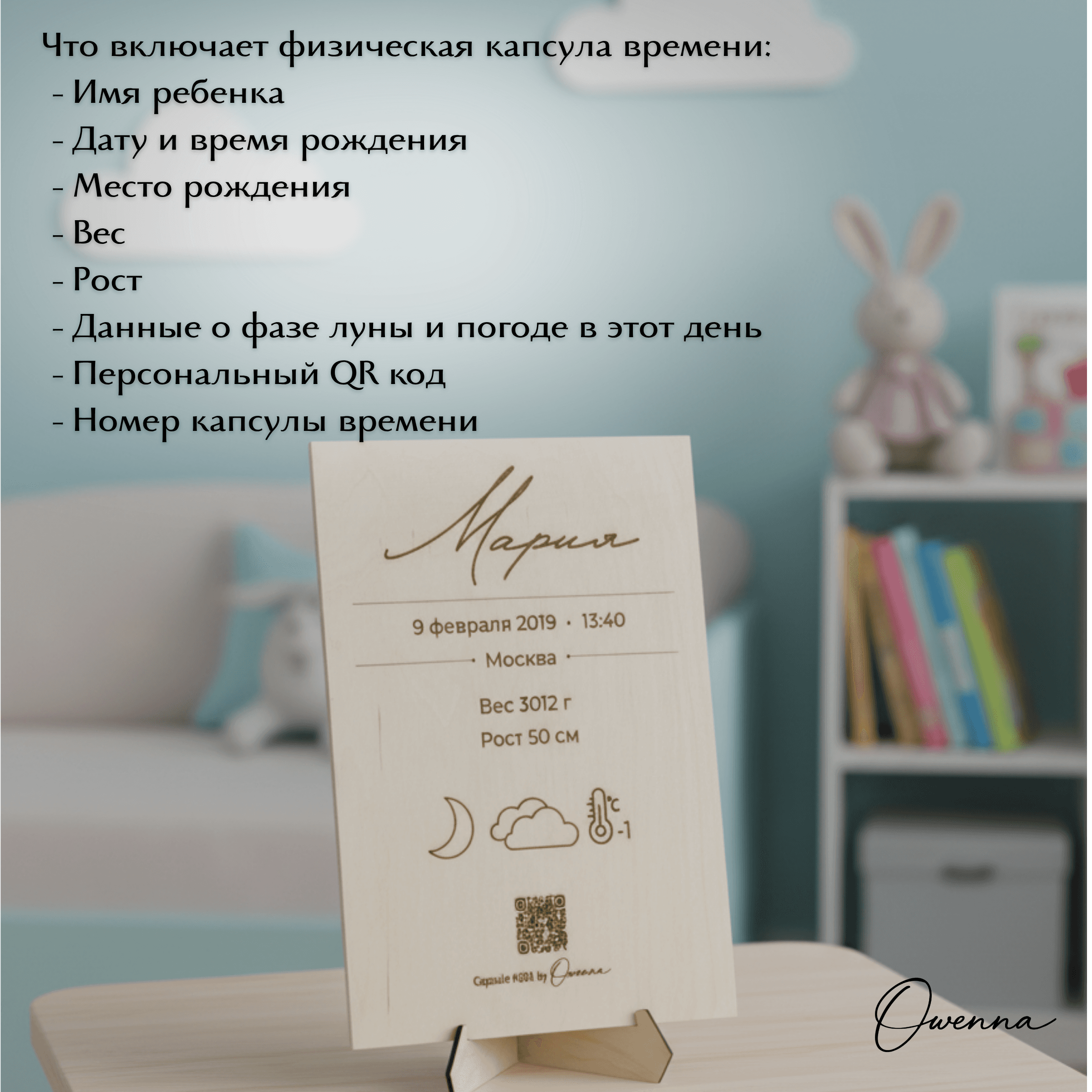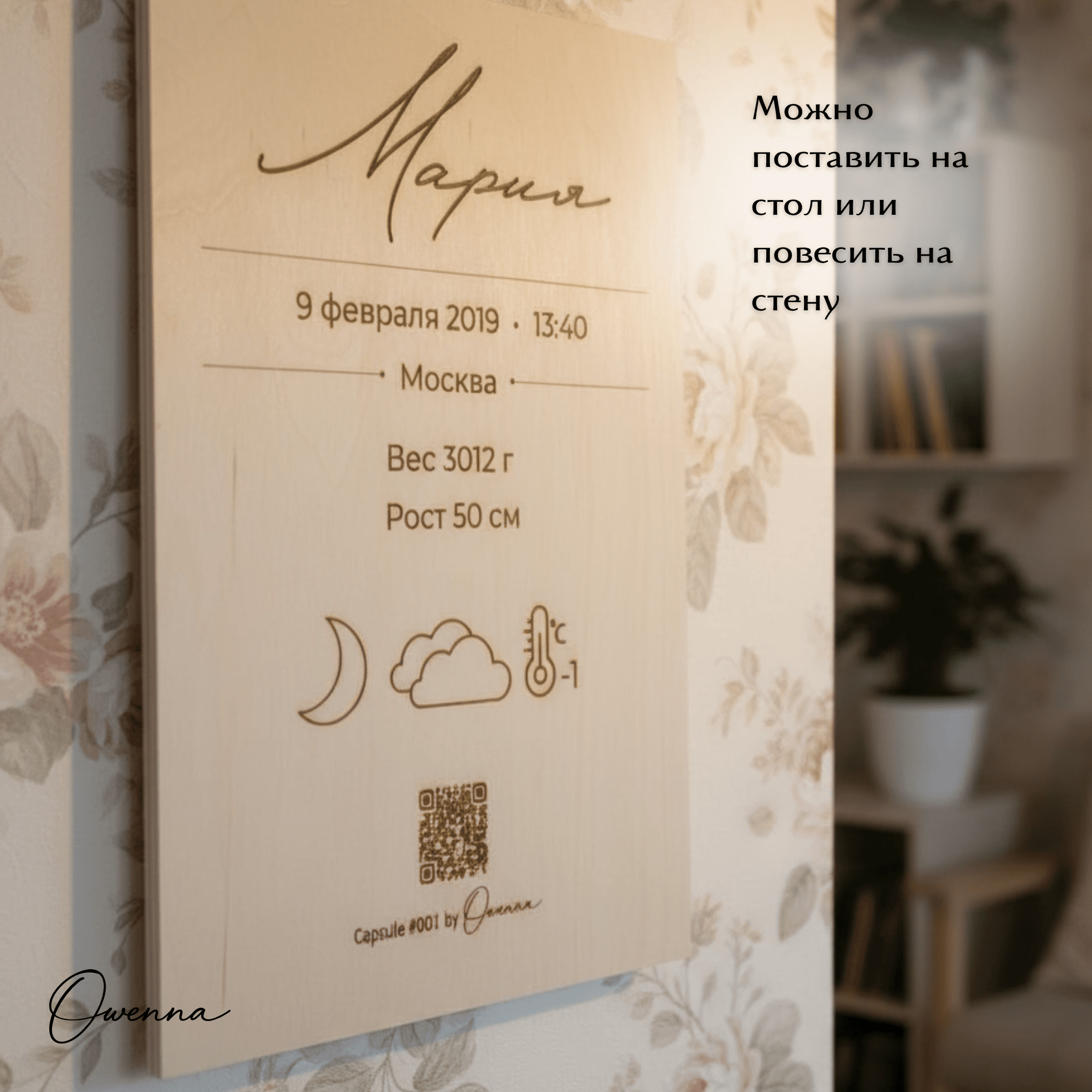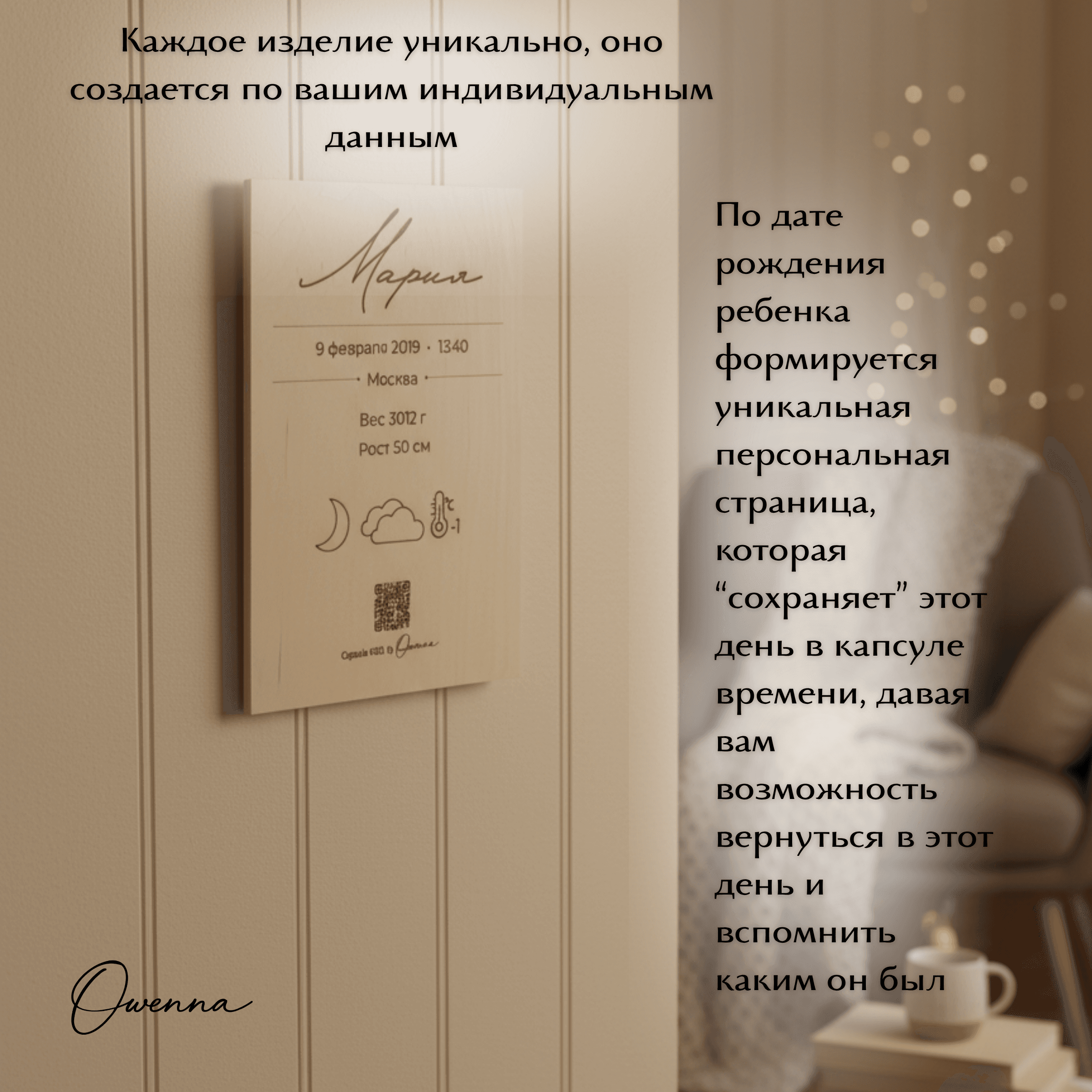 Owenna — это капсула времени о рождении вашего малыша. Персонализированное изделие, метрика с QR-кодом, ведущим на цифровую страницу с историей первых мгновений жизни: датой рождения, местом, фотографиями, погодой, тёплым семейным посланием и многим другим В комплекте — архивная PDF-копия и 2 года хранения цифровой капсулы. Что входит: • изделие с индивидуальной лазерной гравировкой метрики • QR-код на цифровую капсулу • персональная онлайн-страница малыша • PDF-архив капсулы для личного хранения • 2 года хранения цифровой версии Если вам нужно сделать несколько копий метрики на фанере, сообщите нам об этом при заказе. Стоимость копии метрики на фанере 450 руб. Капсула Owenna — это трогательный подарок на рождение, выписку или первые дни жизни малыша. Выберите подходящий материал изготовления капсулы: бумага, фанера, дерево.