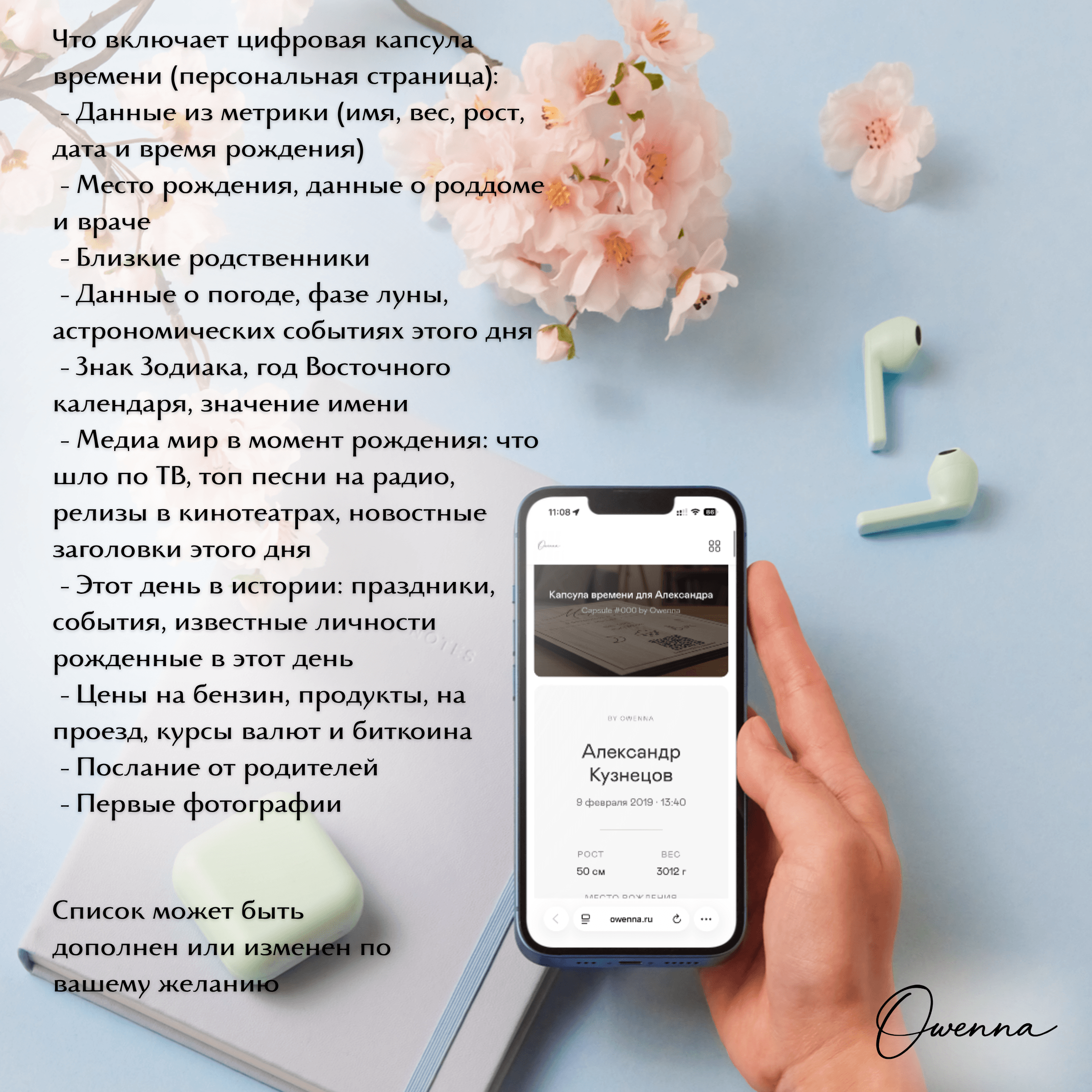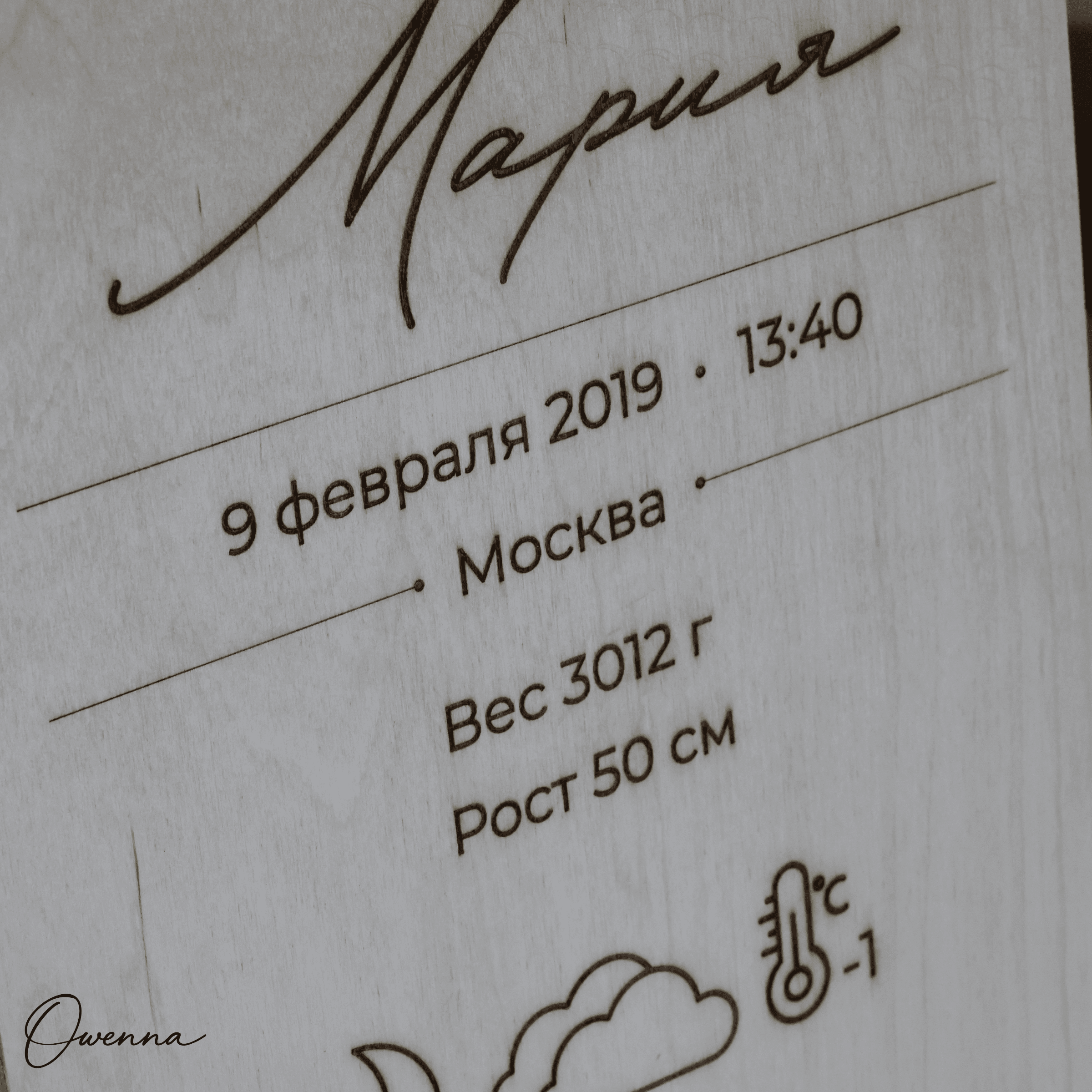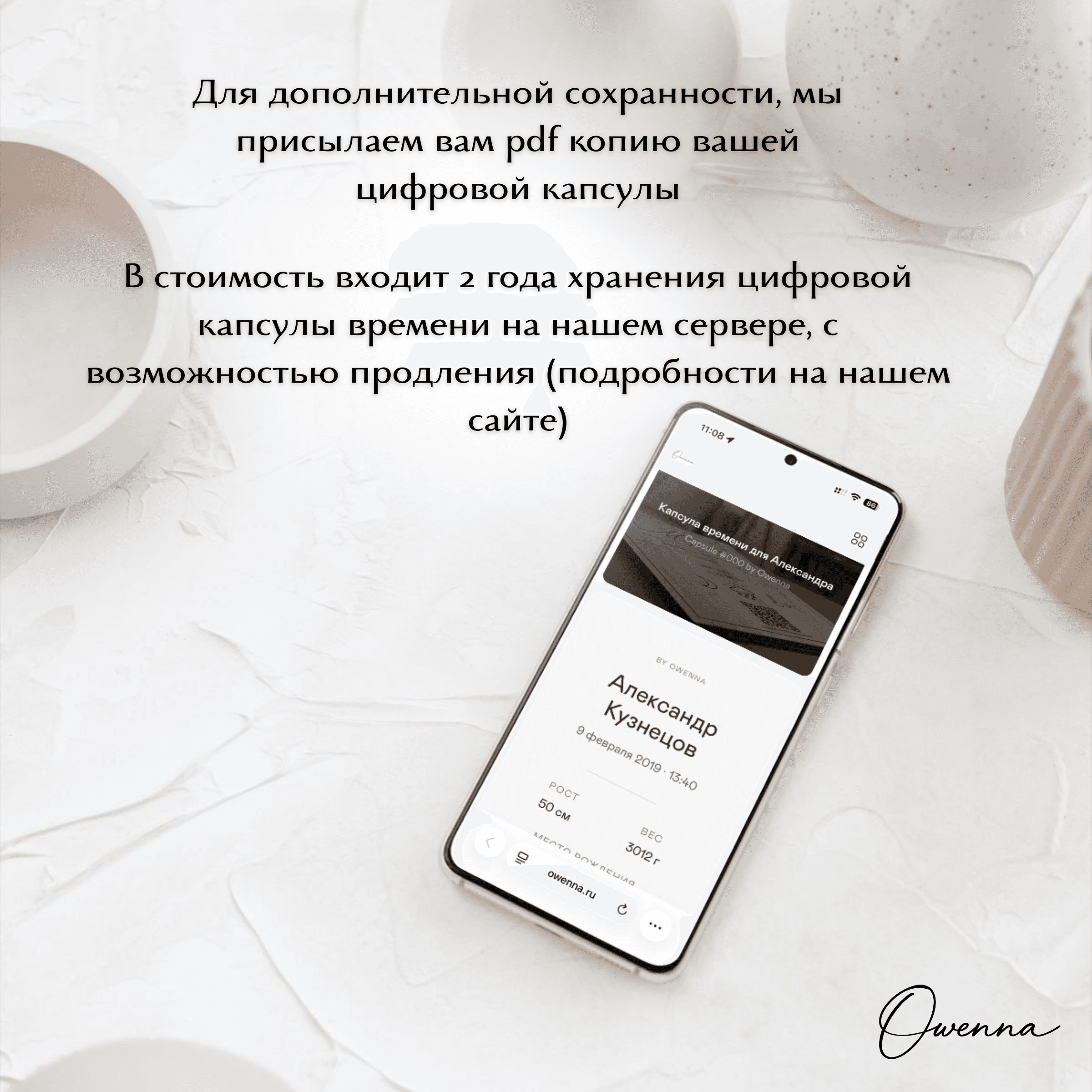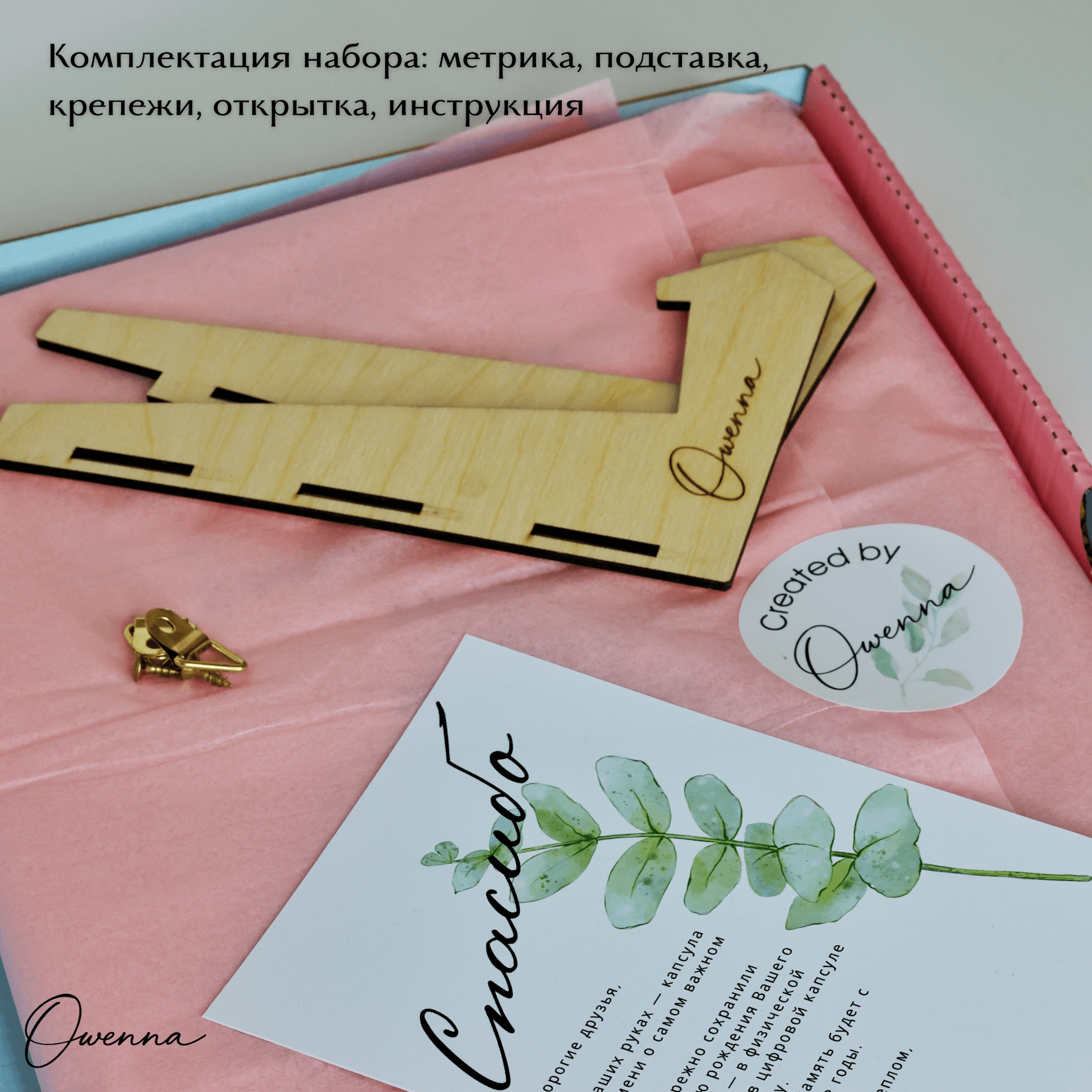 Owenna — это капсула времени о рождении вашего малыша. Персонализированное изделие, метрика с QR-кодом, ведущим на цифровую страницу с историей первых мгновений жизни: датой рождения, местом, фотографиями, погодой, тёплым семейным посланием и многим другим В комплекте — архивная PDF-копия и 2 года хранения цифровой капсулы. Что входит: • изделие с индивидуальной лазерной гравировкой метрики • QR-код на цифровую капсулу • персональная онлайн-страница малыша • PDF-архив капсулы для личного хранения • 2 года хранения цифровой версии Если вам нужно сделать несколько копий метрики на фанере, сообщите нам об этом при заказе. Стоимость копии метрики на фанере 450 руб. Капсула Owenna — это трогательный подарок на рождение, выписку или первые дни жизни малыша. Выберите подходящий материал изготовления капсулы: бумага, фанера, дерево.