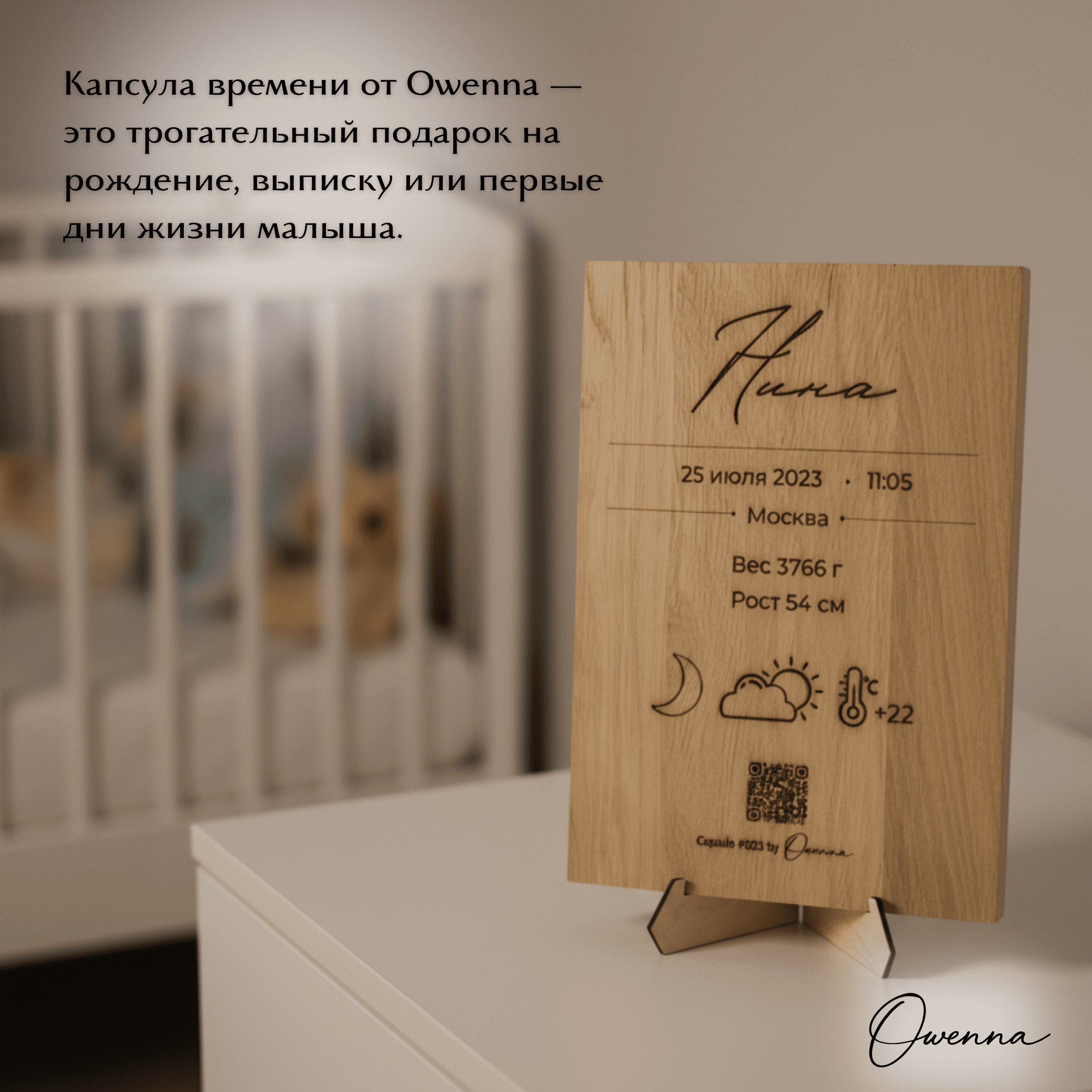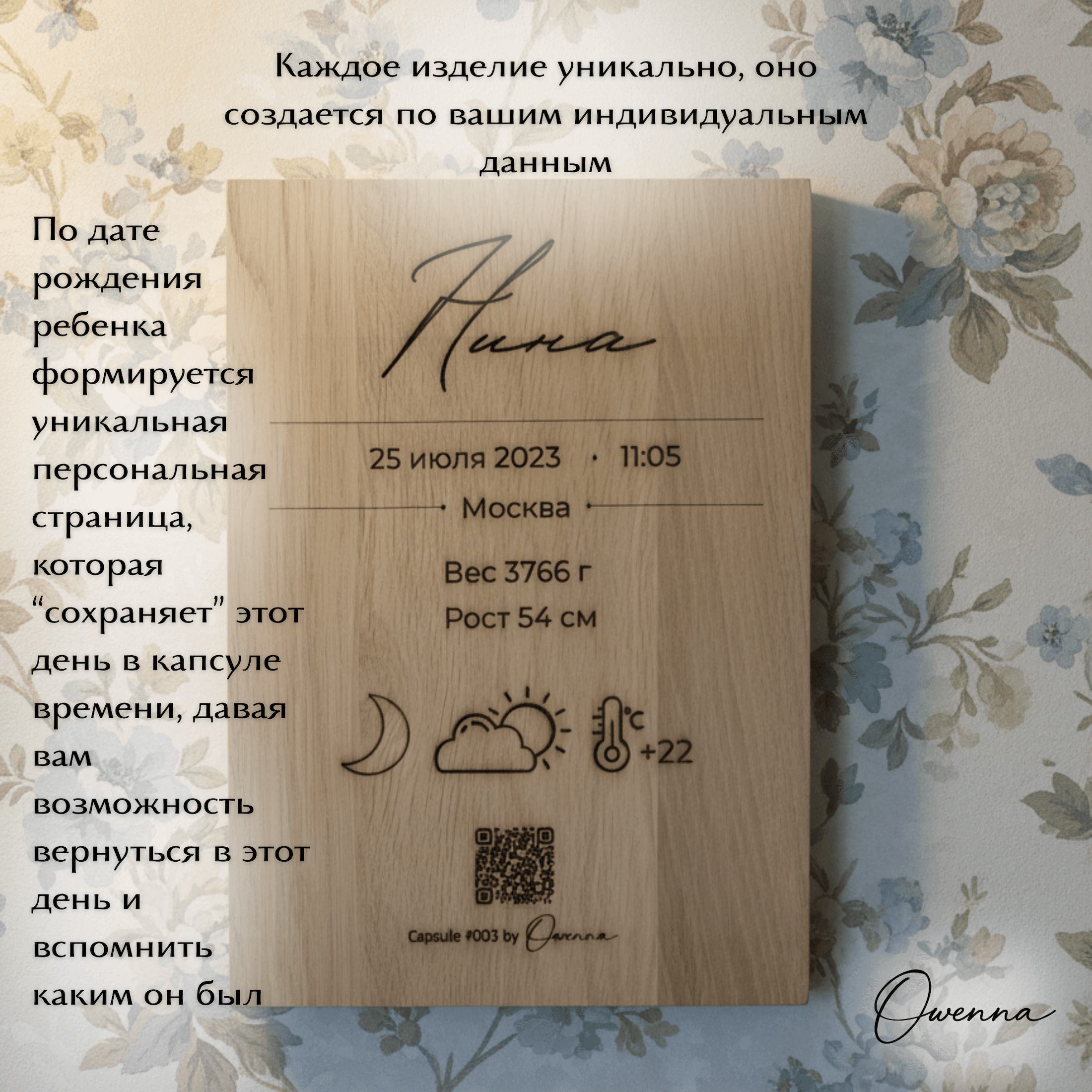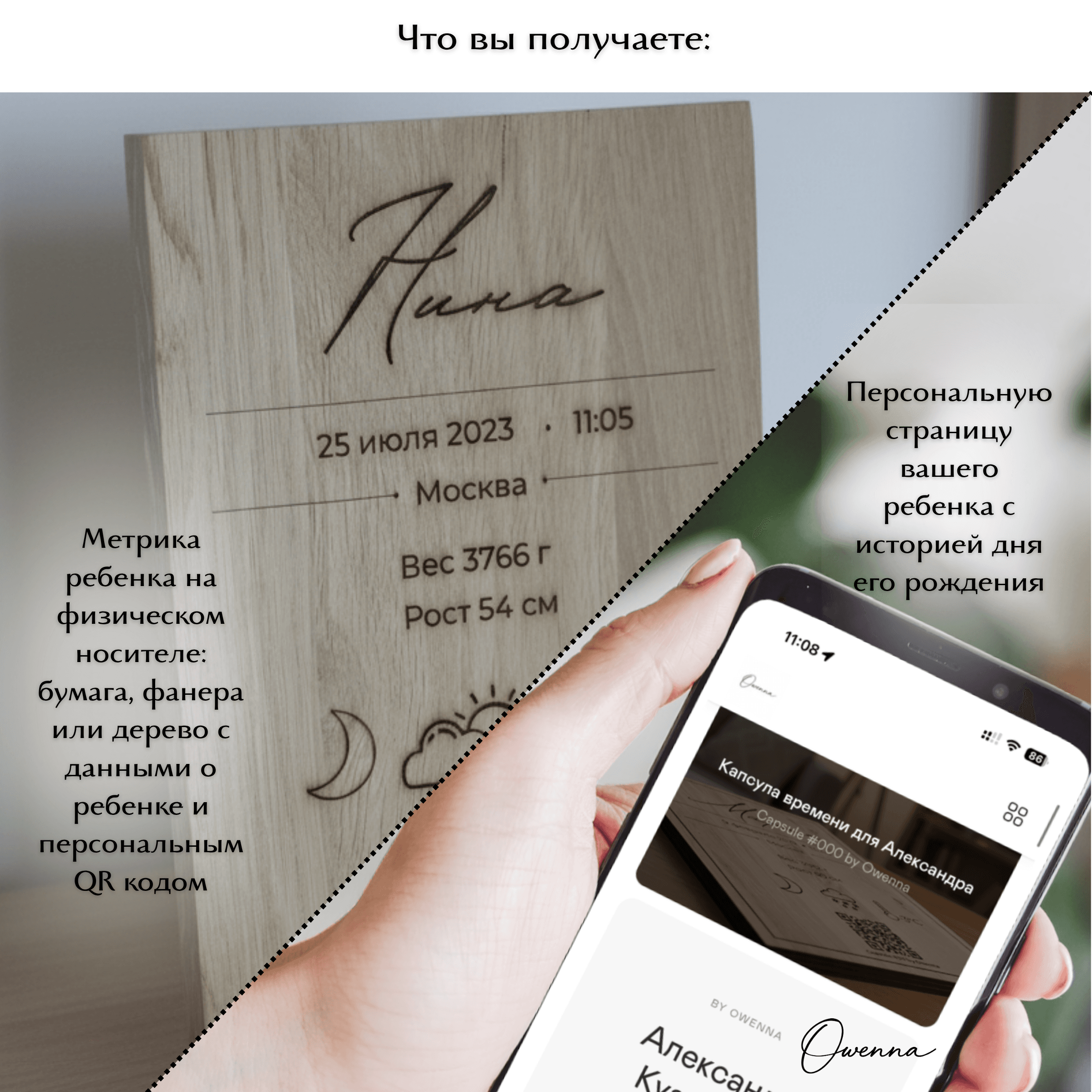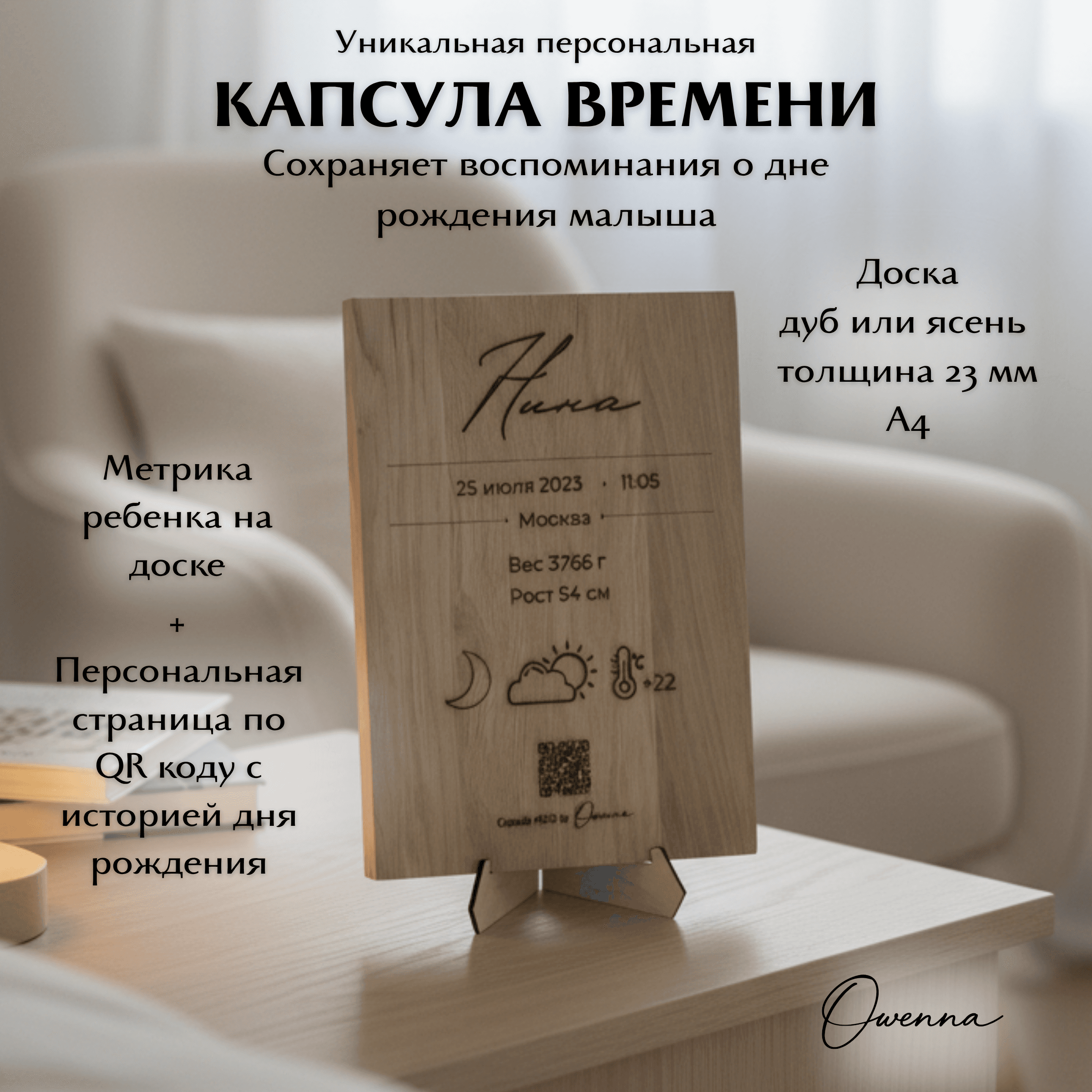 Owenna — это капсула времени о рождении вашего малыша. Персонализированное изделие, метрика с QR-кодом и персональной лазерной гравировкой на деревянной доске из дуба или ясеня, ведущим на цифровую страницу с историей первых мгновений жизни: датой рождения, местом, фотографиями, погодой, тёплым семейным посланием и многим другим В комплекте — архивная PDF-копия и 2 года хранения цифровой капсулы. Что входит: • изделие с индивидуальной лазерной гравировкой метрики • QR-код на цифровую капсулу • персональная онлайн-страница малыша • PDF-архив капсулы для личного хранения • 2 года хранения цифровой версии Если вам нужно сделать несколько копий метрики на доске из дуба или ясеня, сообщите нам об этом при заказе. Стоимость копии метрики на доске из дуба или ясеня 1750 руб. Капсула Owenna — это трогательный подарок на рождение, выписку или первые дни жизни малыша. Выберите подходящий материал изготовления капсулы: бумага, фанера, дерево.