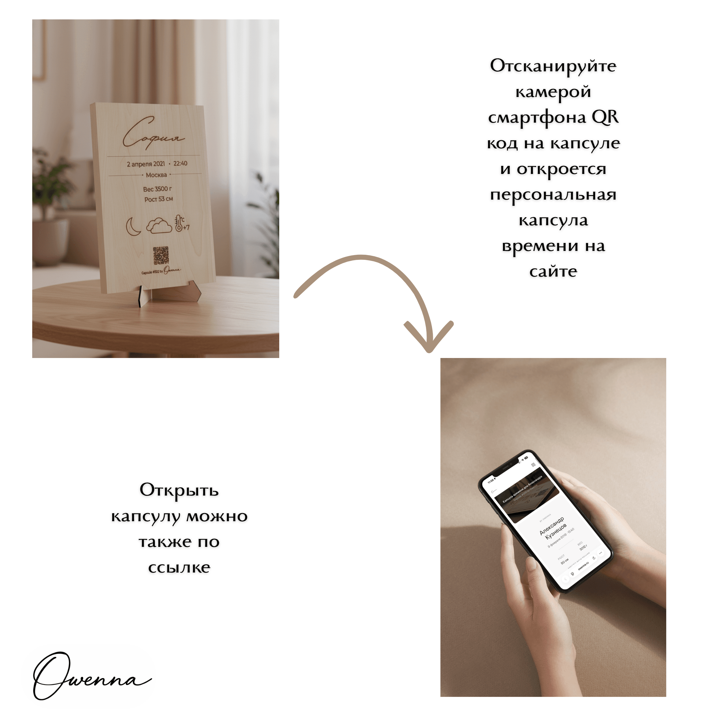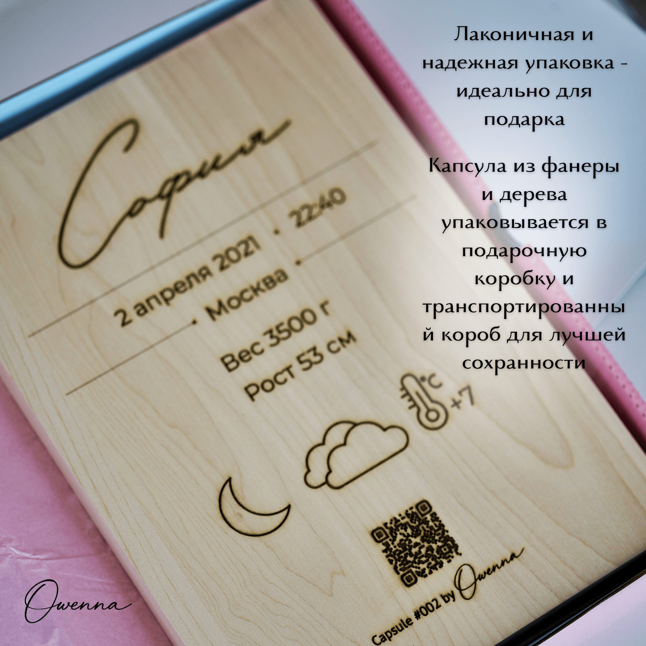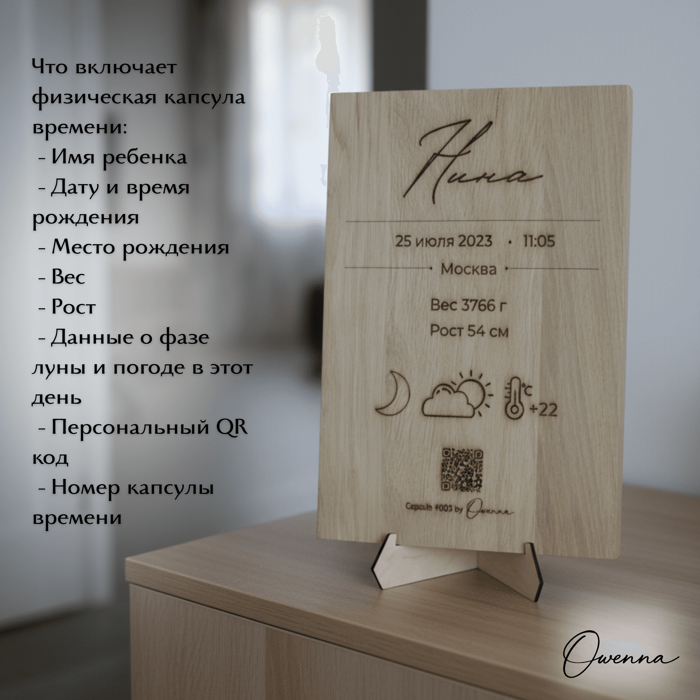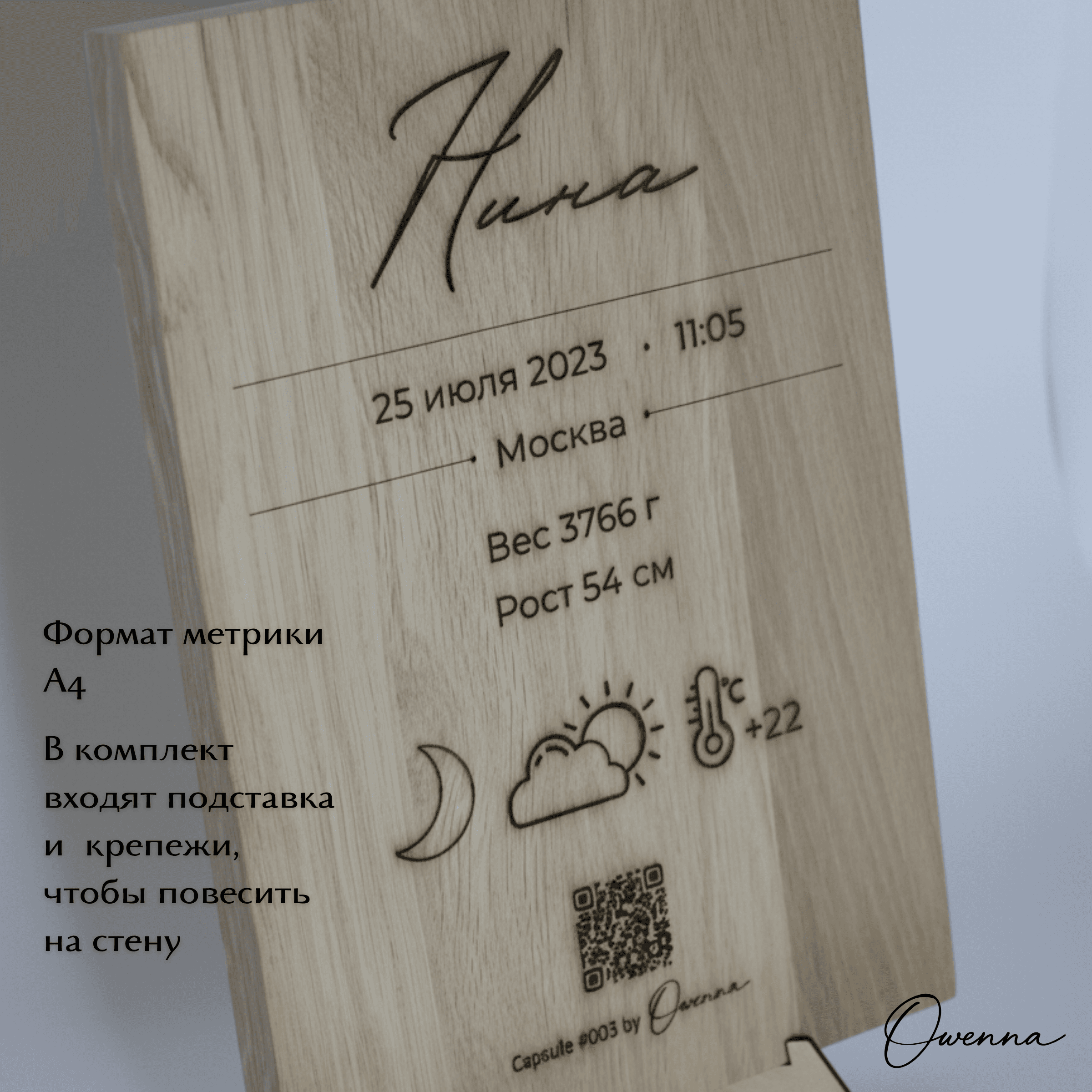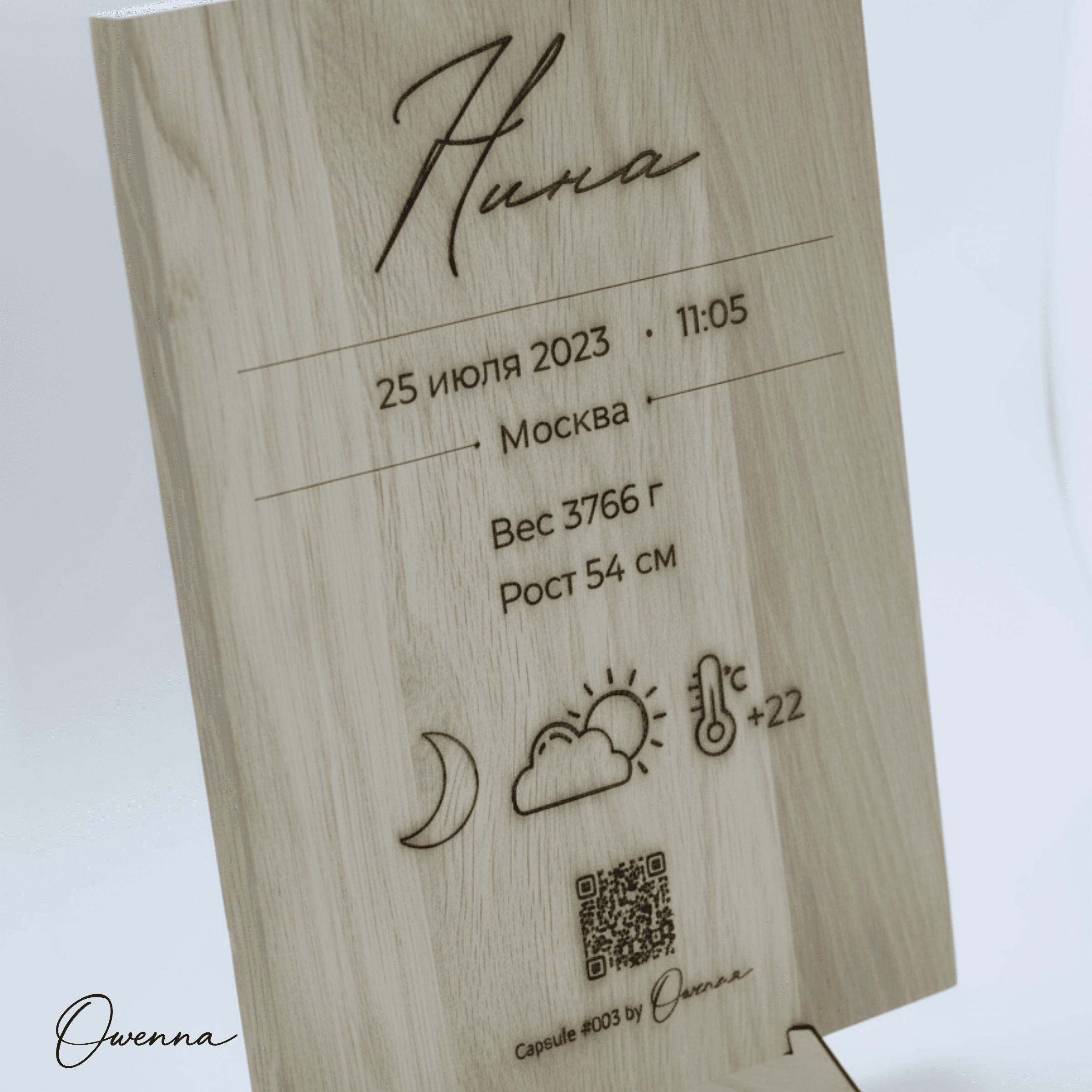 Owenna — это капсула времени о рождении вашего малыша. Персонализированное изделие, метрика с QR-кодом и персональной лазерной гравировкой на деревянной доске из дуба или ясеня, ведущим на цифровую страницу с историей первых мгновений жизни: датой рождения, местом, фотографиями, погодой, тёплым семейным посланием и многим другим В комплекте — архивная PDF-копия и 2 года хранения цифровой капсулы. Что входит: • изделие с индивидуальной лазерной гравировкой метрики • QR-код на цифровую капсулу • персональная онлайн-страница малыша • PDF-архив капсулы для личного хранения • 2 года хранения цифровой версии Если вам нужно сделать несколько копий метрики на доске из дуба или ясеня, сообщите нам об этом при заказе. Стоимость копии метрики на доске из дуба или ясеня 1750 руб. Капсула Owenna — это трогательный подарок на рождение, выписку или первые дни жизни малыша. Выберите подходящий материал изготовления капсулы: бумага, фанера, дерево.