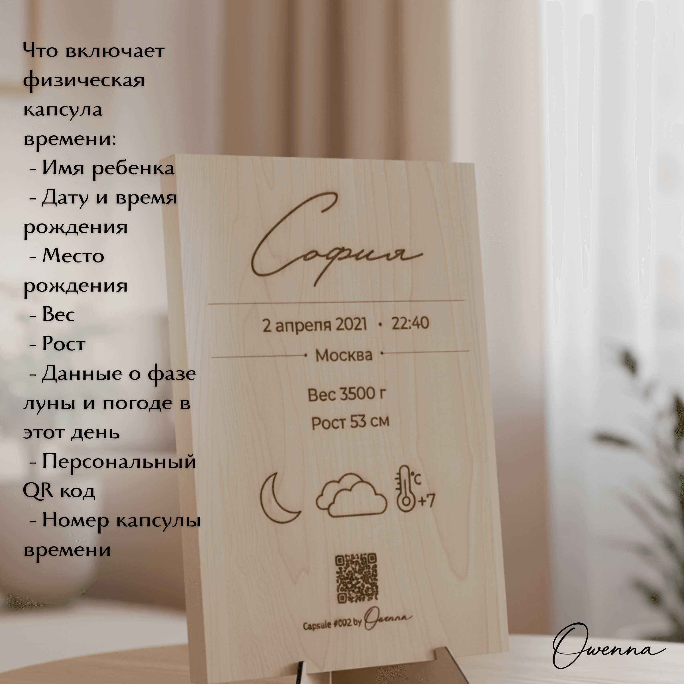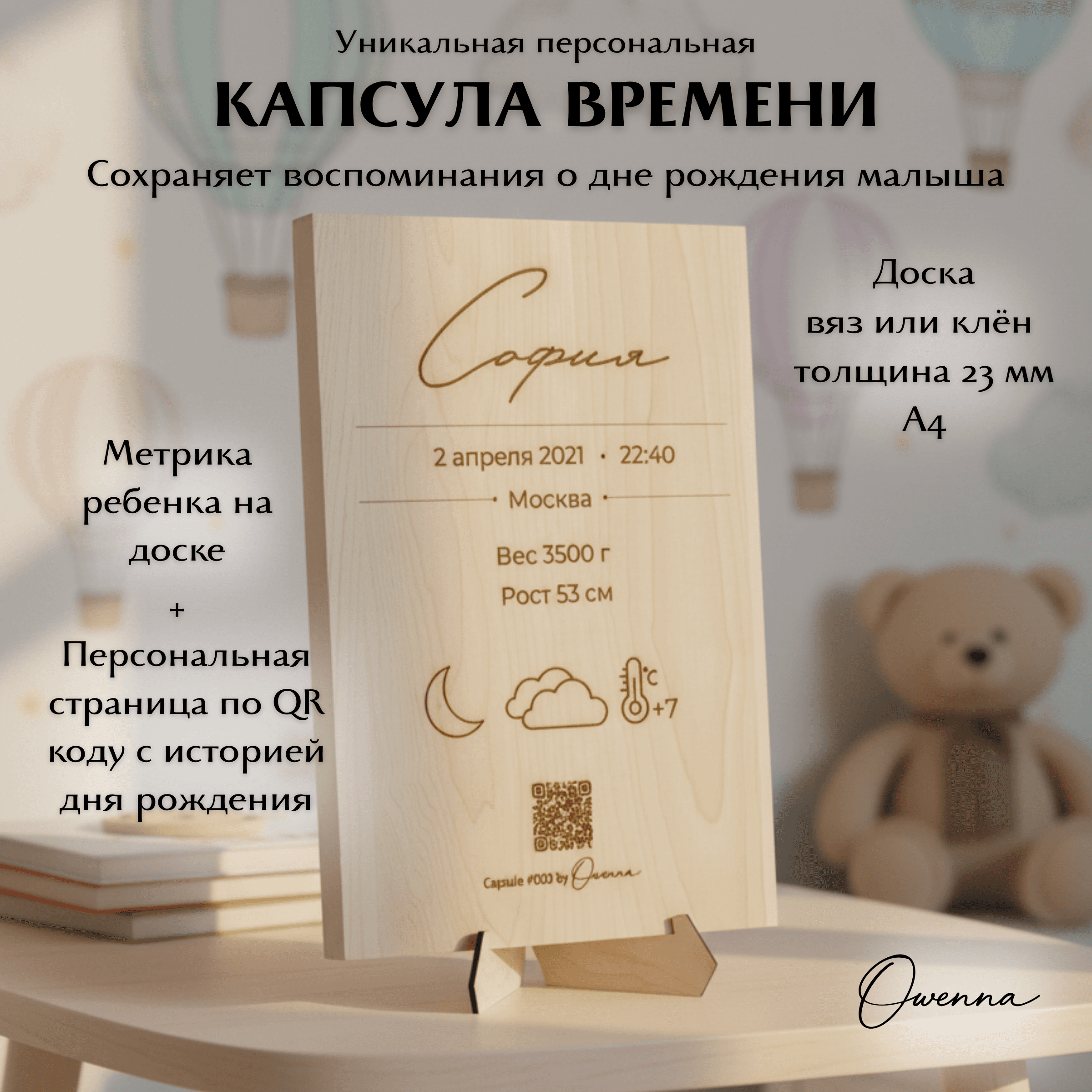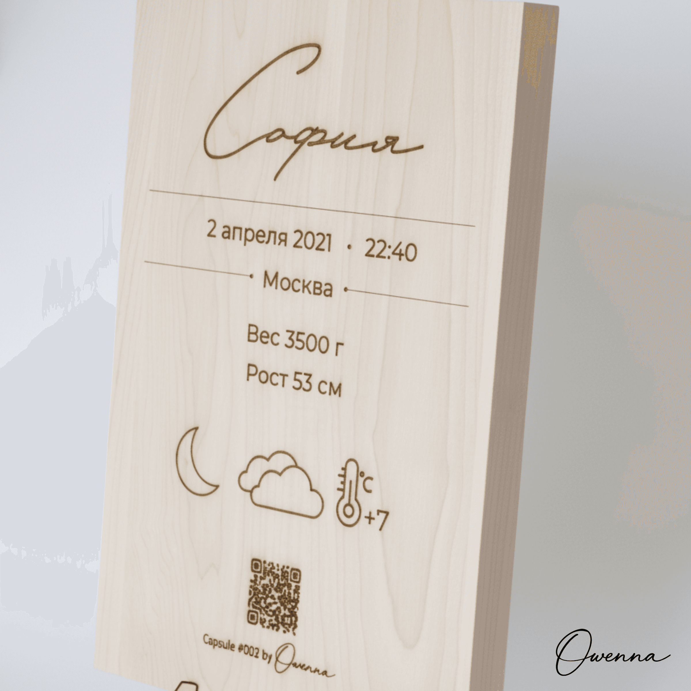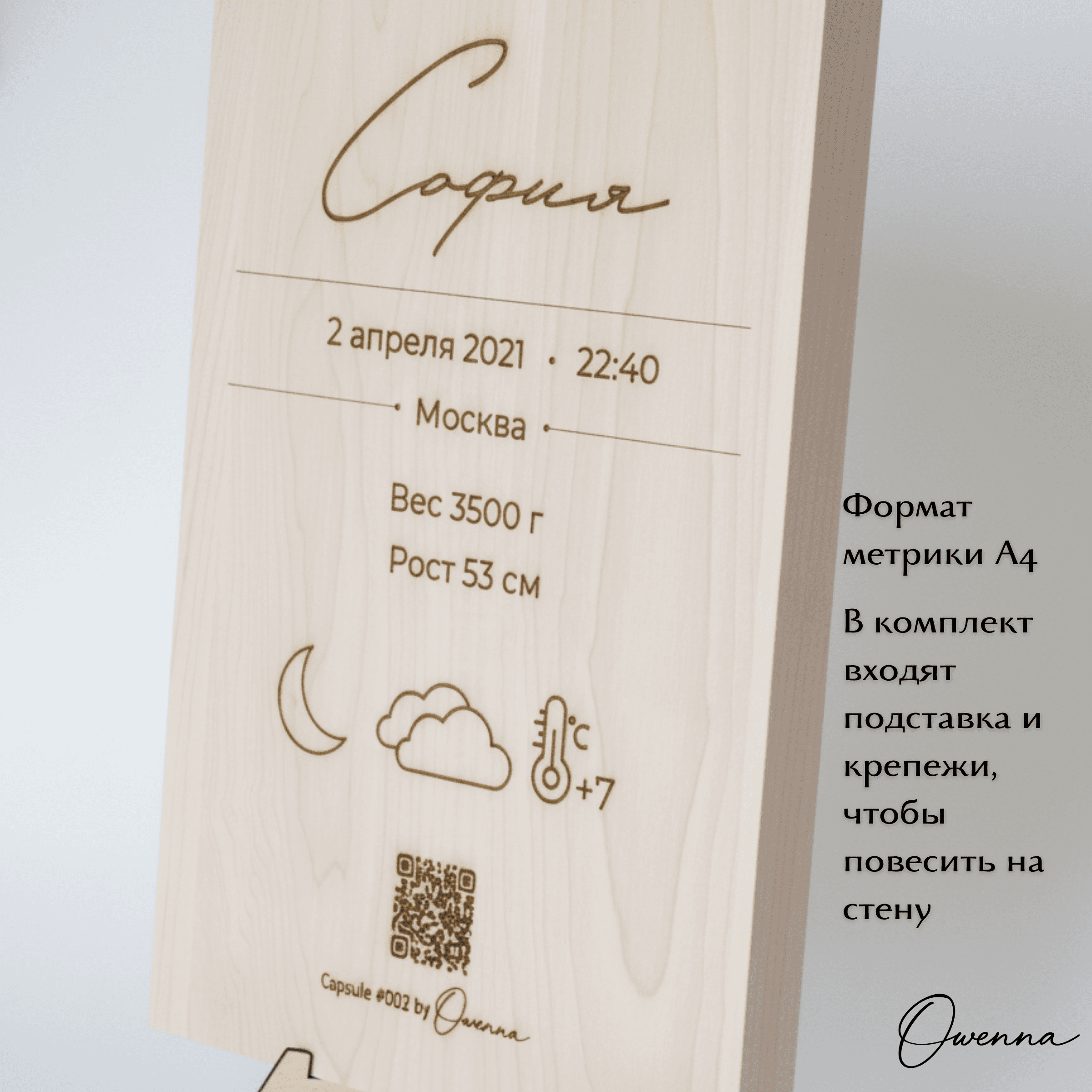 Owenna — это капсула времени о рождении вашего малыша. Персонализированное изделие, метрика с QR-кодом и персональной лазерной гравировкой на деревянной доске из вяза или клёна, ведущим на цифровую страницу с историей первых мгновений жизни: датой рождения, местом, фотографиями, погодой, тёплым семейным посланием и многим другим В комплекте — архивная PDF-копия и 2 года хранения цифровой капсулы. Что входит: • изделие с индивидуальной лазерной гравировкой метрики • QR-код на цифровую капсулу • персональная онлайн-страница малыша • PDF-архив капсулы для личного хранения • 2 года хранения цифровой версии Если вам нужно сделать несколько копий метрики на доске из вяза или клена, сообщите нам об этом при заказе. Стоимость копии метрики на доске из вяза или клена 1350 руб. Капсула Owenna — это трогательный подарок на рождение, выписку или первые дни жизни малыша. Выберите подходящий материал изготовления капсулы: бумага, фанера, дерево.