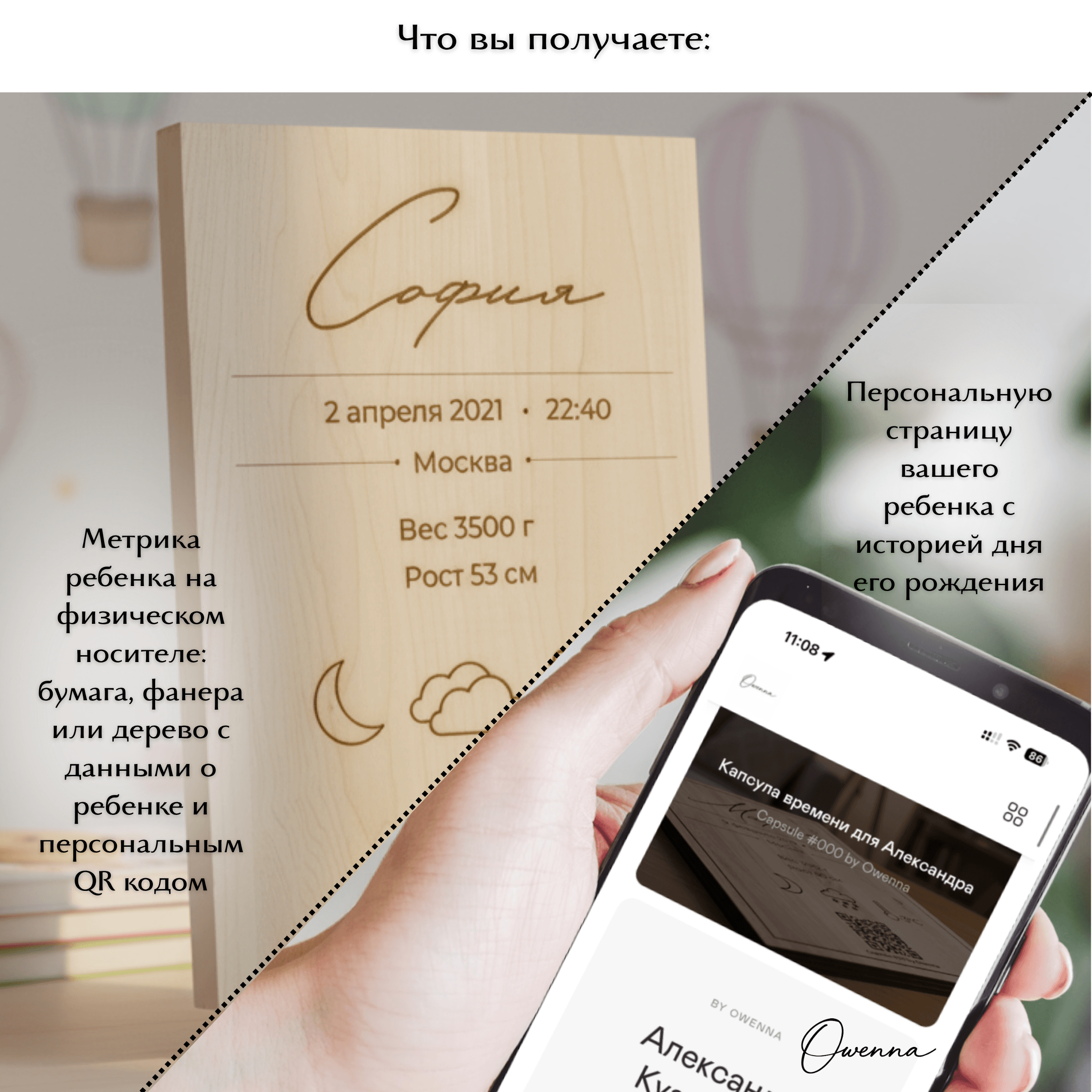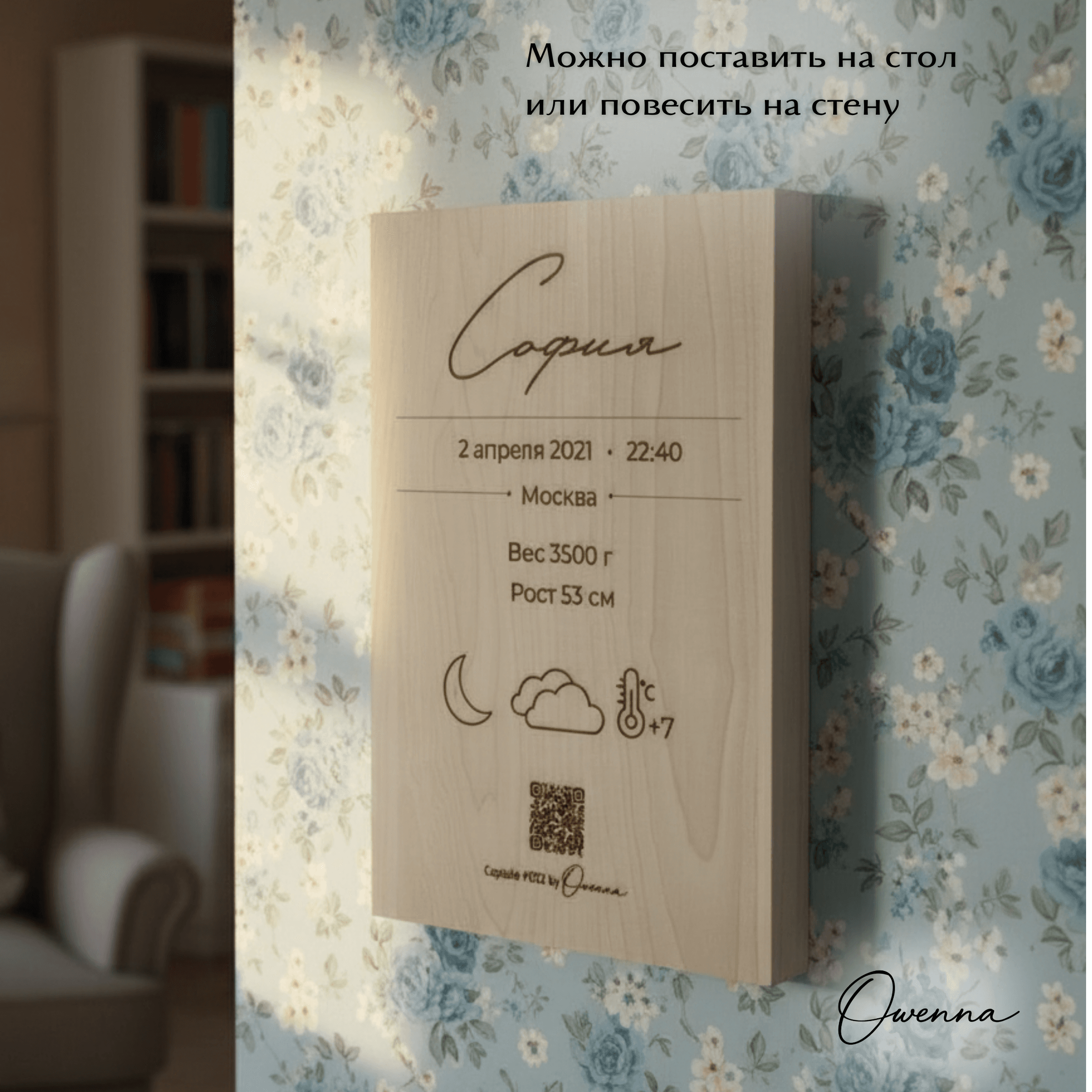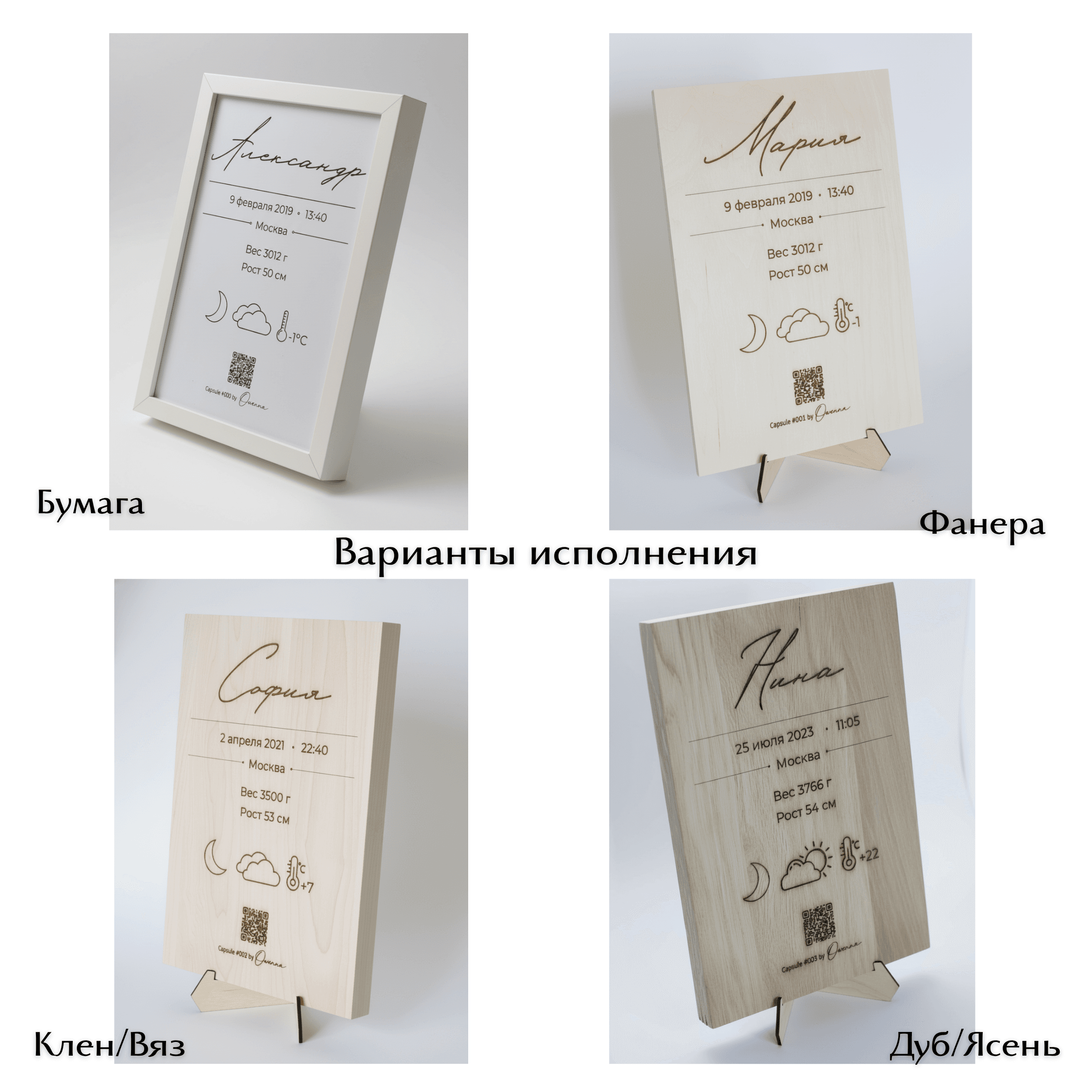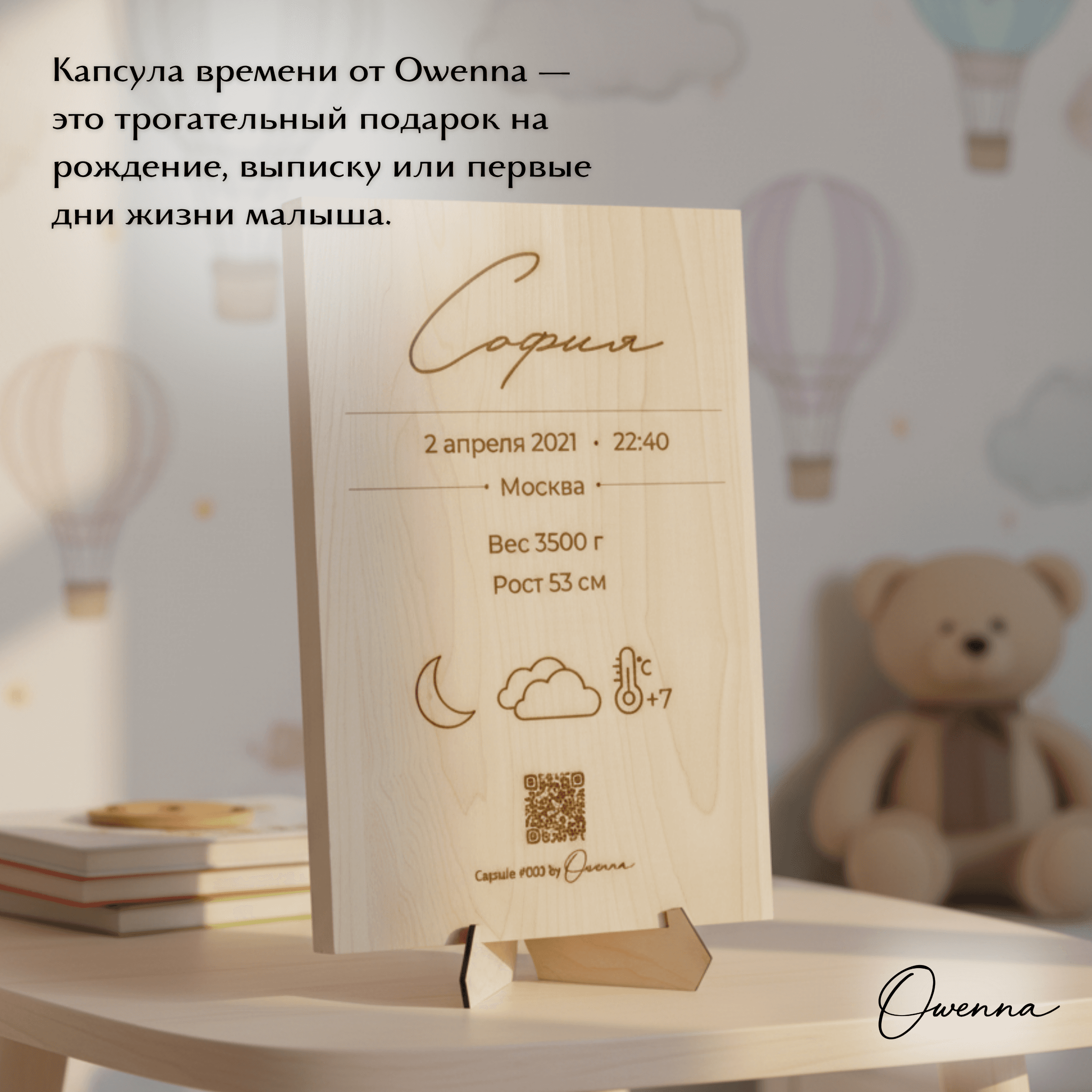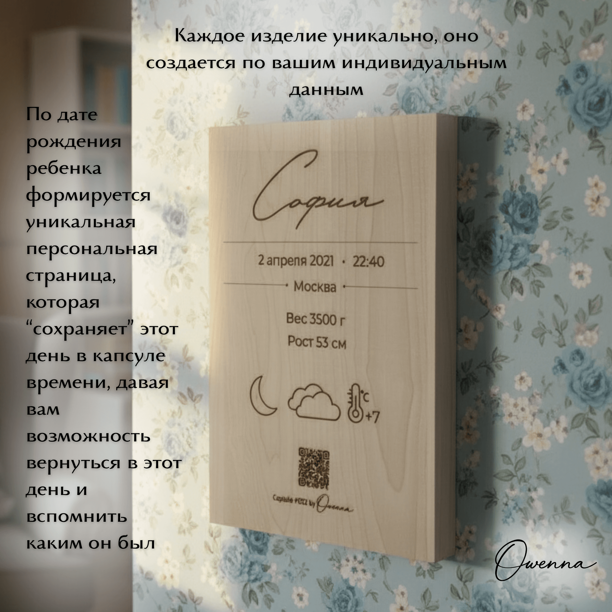 Owenna — это капсула времени о рождении вашего малыша. Персонализированное изделие, метрика с QR-кодом и персональной лазерной гравировкой на деревянной доске из вяза или клёна, ведущим на цифровую страницу с историей первых мгновений жизни: датой рождения, местом, фотографиями, погодой, тёплым семейным посланием и многим другим В комплекте — архивная PDF-копия и 2 года хранения цифровой капсулы. Что входит: • изделие с индивидуальной лазерной гравировкой метрики • QR-код на цифровую капсулу • персональная онлайн-страница малыша • PDF-архив капсулы для личного хранения • 2 года хранения цифровой версии Если вам нужно сделать несколько копий метрики на доске из вяза или клена, сообщите нам об этом при заказе. Стоимость копии метрики на доске из вяза или клена 1350 руб. Капсула Owenna — это трогательный подарок на рождение, выписку или первые дни жизни малыша. Выберите подходящий материал изготовления капсулы: бумага, фанера, дерево.